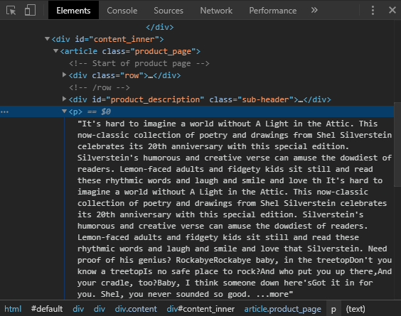 When inspecting the HTML of a book's page, you can see that the description is just plain text stored in a paragraph. However, this paragraph is not the first in the article with a product_page class that doesn't have a specified class. If you try to use the find()