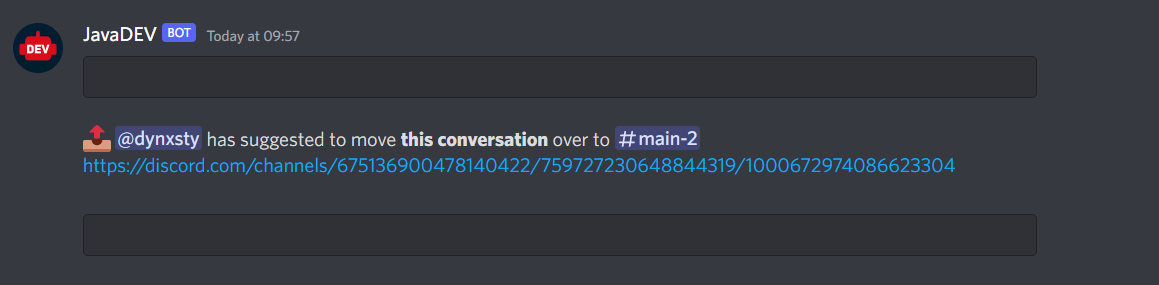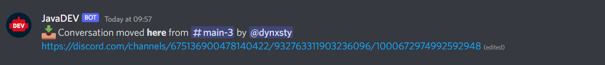 /move-conversation, which makes it easier for users to easily move conversations to other channels by clicking the links the bot provides. It is highly inspired by the Rust Community Discord, where this works quite well.