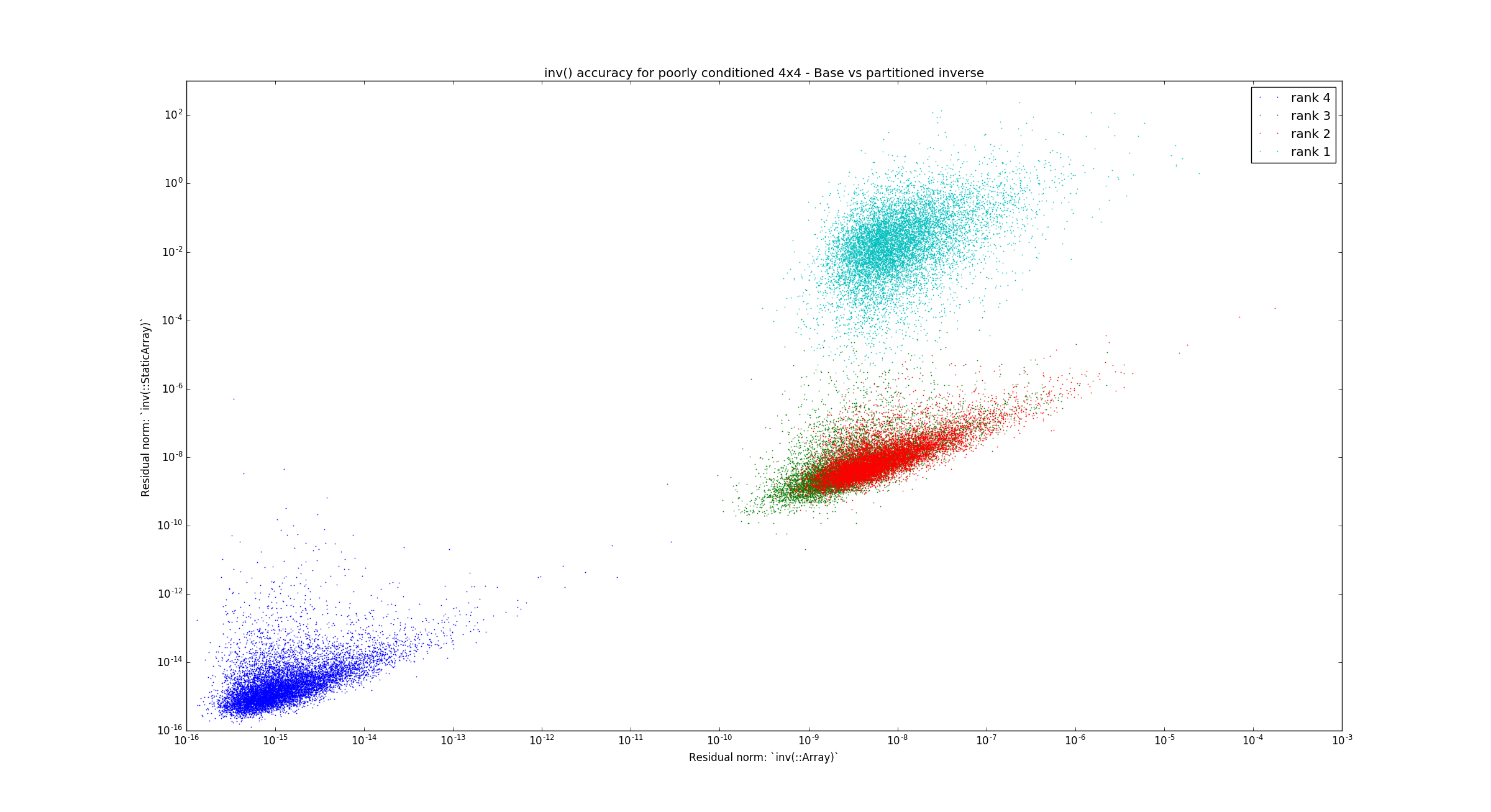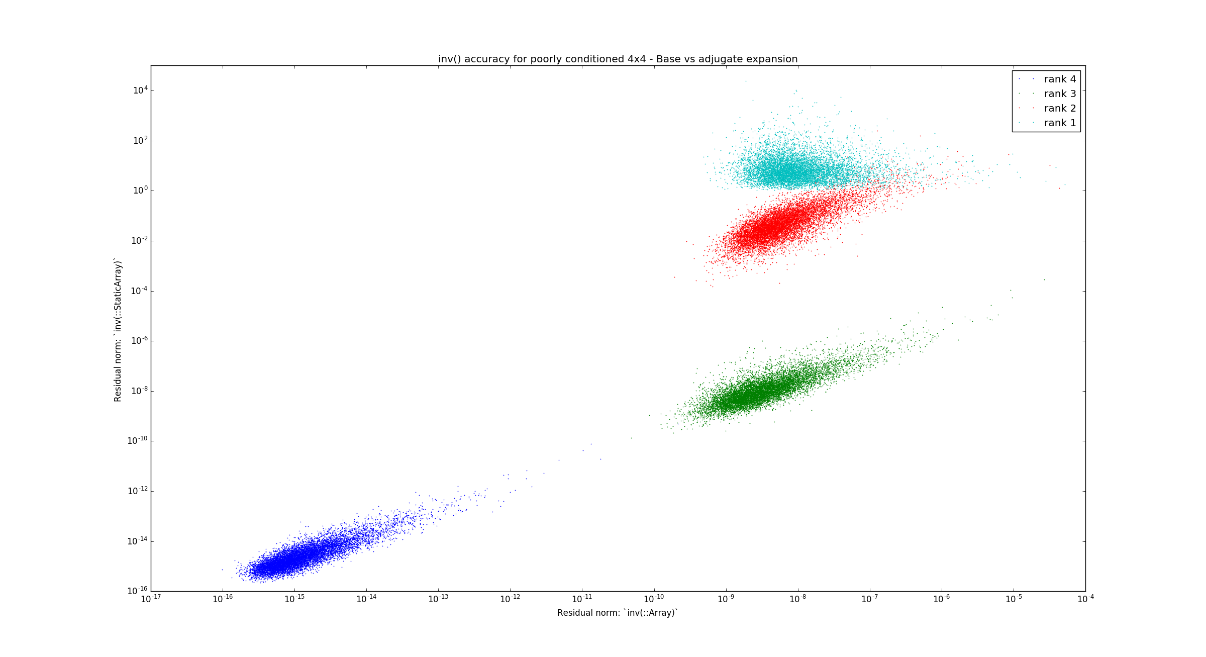 Ah, this one slipped off my radar. Looks good now thanks. @mschauer I did rerun the problem generator, and it produced the following graphs which compare the two different methods of computing the 4x4 inverse with the Base implementation: Partitioning method (previous) Adjugate method (changes here) So clearly the new method behaves more robustly for well conditioned matrices (the dark blue blob is tight). If nothing else, it's clear we need to do this well, so I think this is a reasonable tradeoff for now. The new method does have some has some systematic problems for approximately low ranked matrices, where if fares a lot worse than the previous method. We'll just have to put up with that for now. |