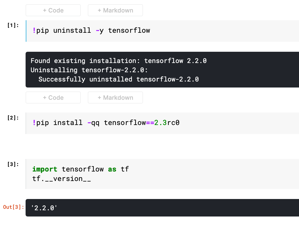 This may sound a bit odd and silly but I am unable to use tf-nighlty or tf=2.3rco in the notebooks. The weird thing is that almost 10 days ago, tf-nightly was working fine. Here is a screenshot for the same: