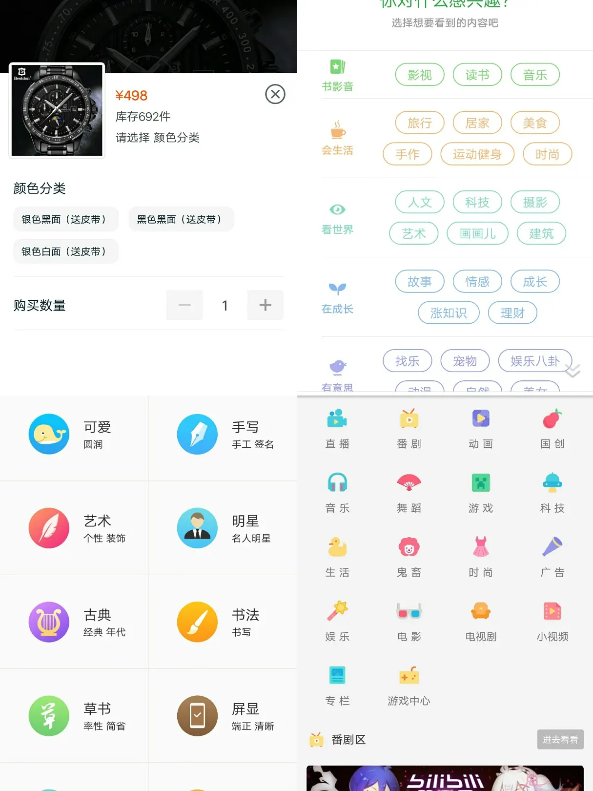 流式布局,在很多标签类的场景中可以用的;而网格布局在分类中以及自拍九宫格等场景很常见。如下所示: