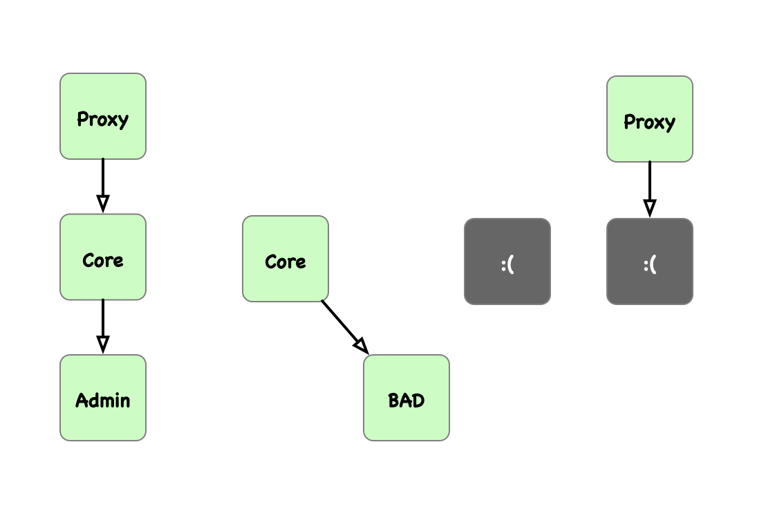 We'll want to immutably store the contract address at deploy time. address immutable private myaddress = address(this); Then, in the vault core, before proxying to the vault admin, we require that we are inside some other proxy before the call with require(myaddress != address(this));