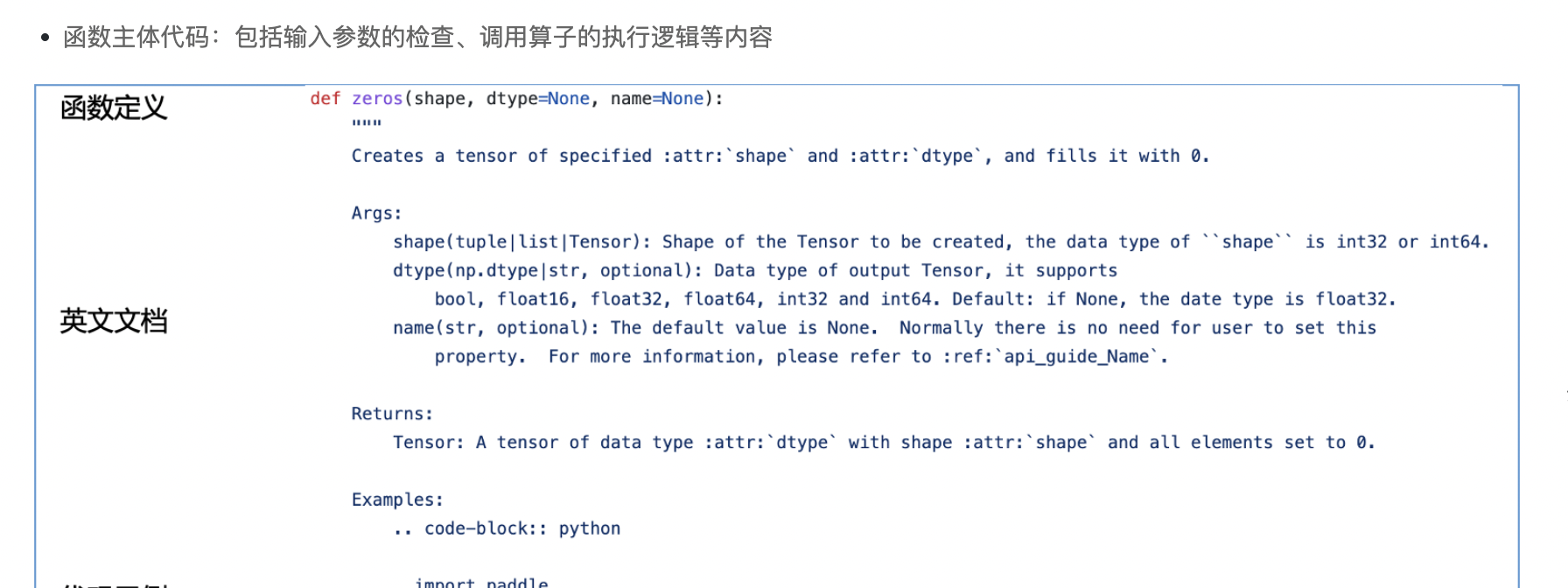 | - 函数主体代码:包括输入参数的检查、调用算子的执行逻辑等内容 | ||
