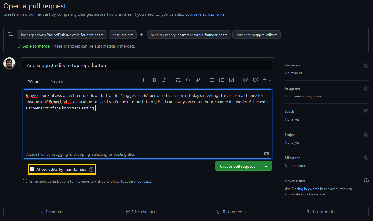 Jupyter book has a built-in extra dropdown button for "suggest edits" per our discussion in today's meeting. This is also a chance for anyone in @ProjectPythia/education to see if you're able to push to my PR. I can always wipe out your change if it works. Attached is a screenshot of the important setting beneath the body text of your PR to enable collaboration from project maintainers. This is enabled by default for me, and if it's disabled then external maintainers will not have default write access to your branch on your fork. Otherwise we might have a permissions issue somewhere? Screenshot attached: