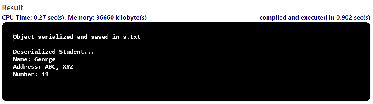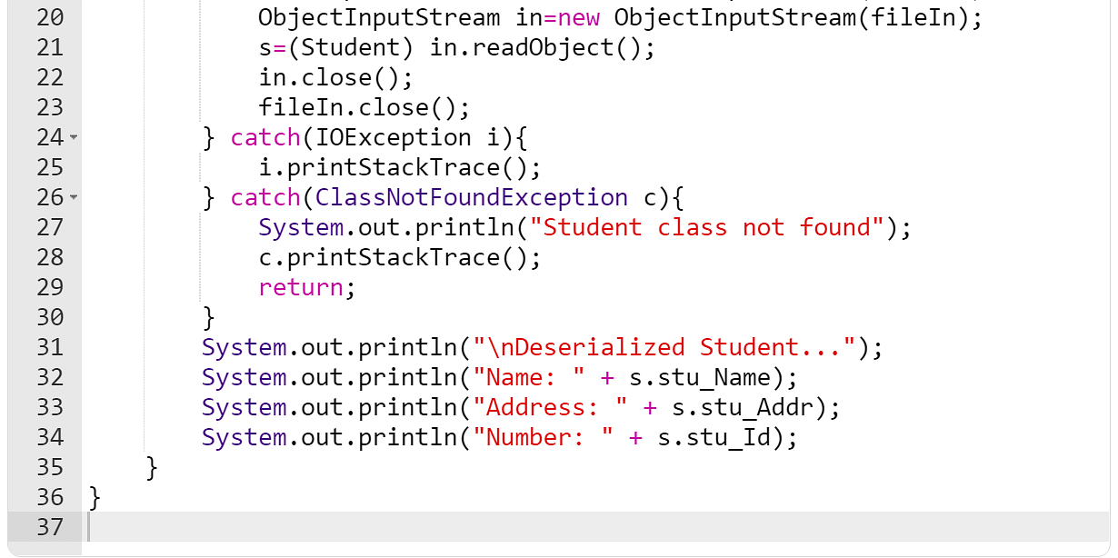 In the code below, you will look at how to deserialize the student object that was have serialized in the above example.