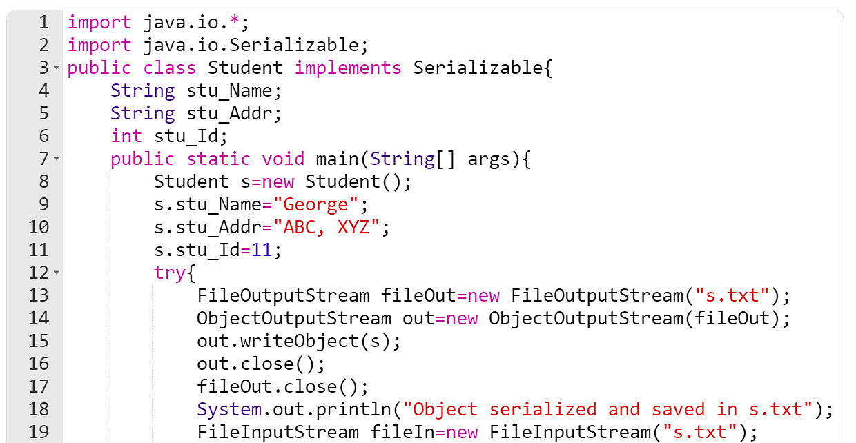 Let’s look at an example to understand how to serialize and de-serialize an object in Java.