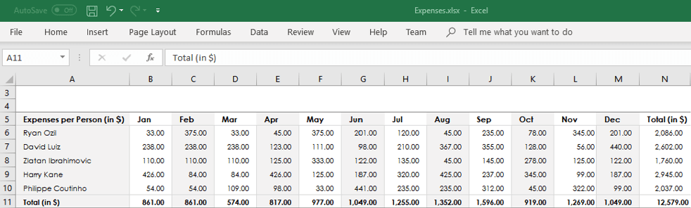 Let us consider a scenario, “Expenses per Person.” The expenses of a person for the whole year is tabulated in the Excel worksheet. In this scenario, you need to add expenses for a new person, Paul Pogba, in a new row and modify the expenses of all tracked people for the month Dec.