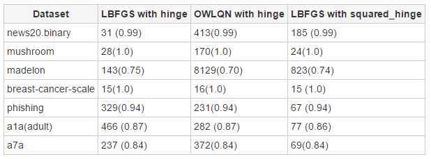 Tested with several larger data set with Hinge Loss function, to compare l-bfgs and owlqn solvers.