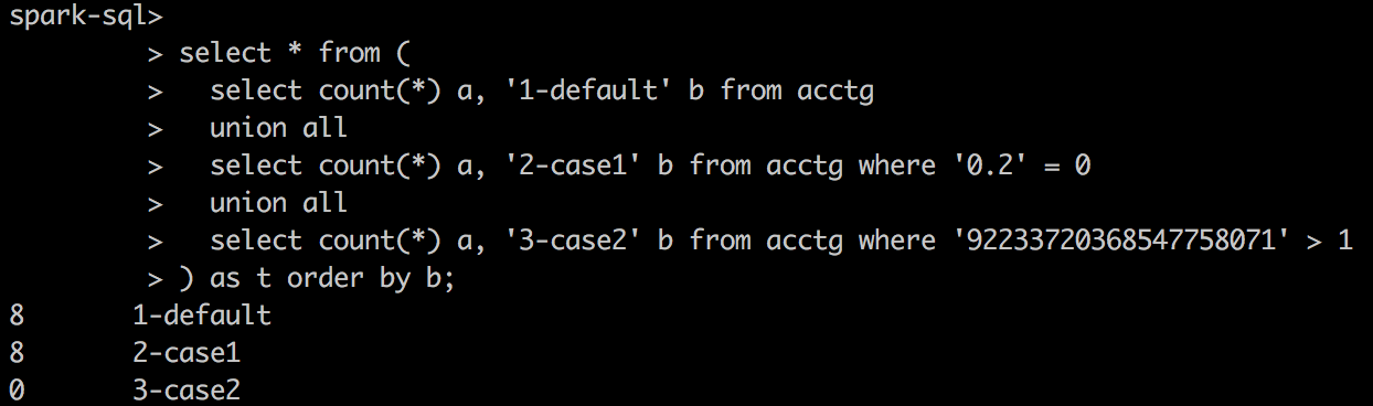 I provide 2 SQL scripts to validate the different result between Spark and Hive: