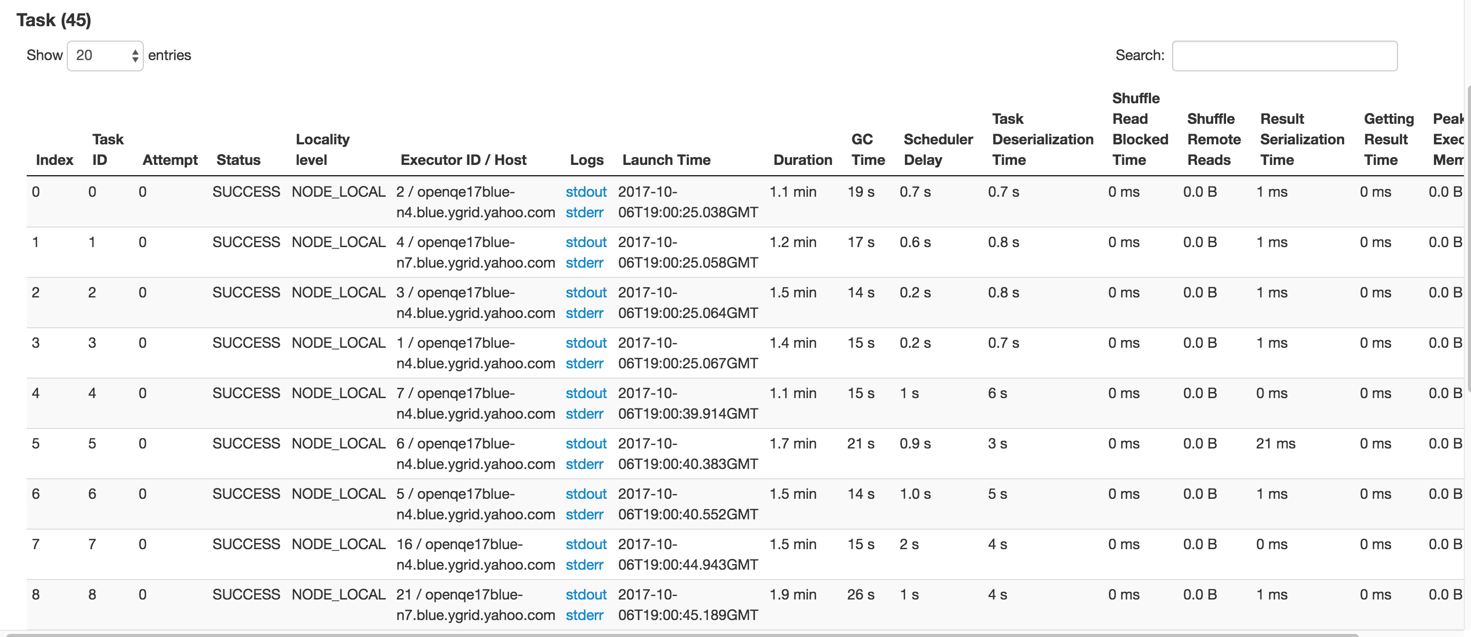 I'm confused about the PR description. It mentions "sorting was disabled if there is any application that has more than one attempt" which as far as I know has nothing to do with the stage page. Also what's a "Stage Server" (from "sort and search for Stage Server")? As far as the change itself, I assume it's only related to the stage page, and from the little javascript I know, you seem to be downloading the whole stage with all its tasks from the REST API. How fast is that with really large stages (e.g. 100k tasks which I think is the default retention)? You can try |