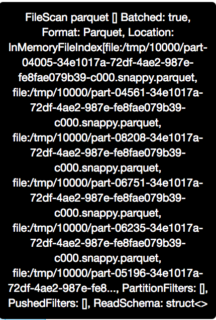 A scenario here is after an application completed, there is no way to know the intact file path of File Scan Exec if the path width is longer than 100 chars. Besides file location, other information (e.g ReadSchema) is also impacted. |