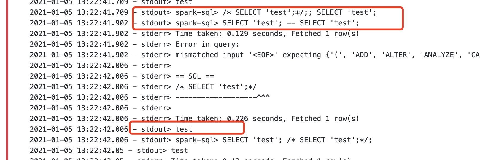 2021-01-05 13:22:41.709 - stdout> spark-sql> /* SELECT 'test';*/;; SELECT 'test';
