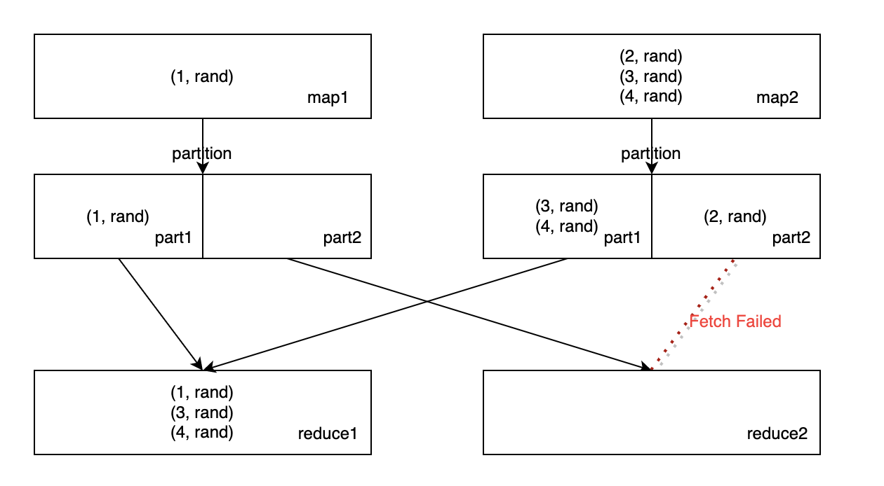 rand, and ShuffleFetchFailed happend, we may get incorrent result since it only retries failed map tasks.To illustrate this, suppose we have a dataset with two columns