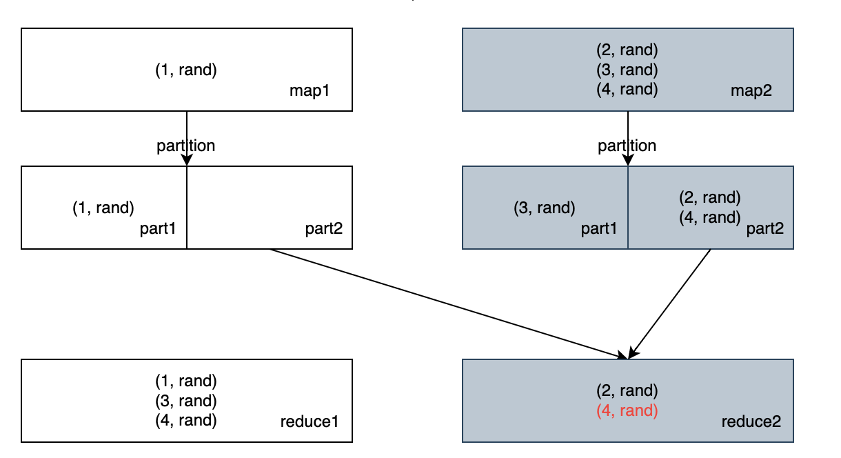 (range(1, 5) as a, rand() as b), we shuffle bybusing two map tasks and two reduce tasks.When there is a fetch failed and we need to rerun map task 2, the generated partitions maybe different compared with last attempt, and finally we get a duplicate record with a = 4