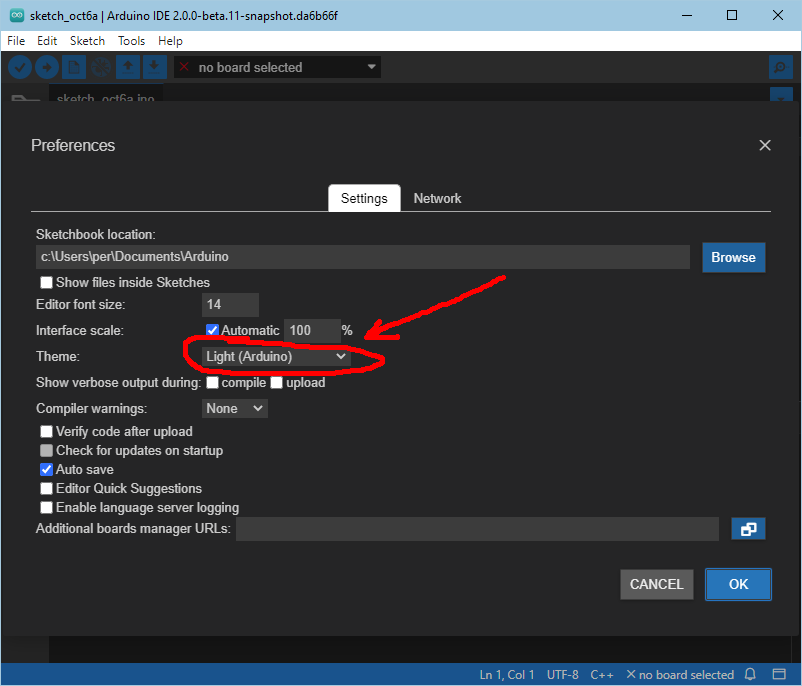 - Open File > Preferences. Note that the theme is set to "Light (Arduino)".