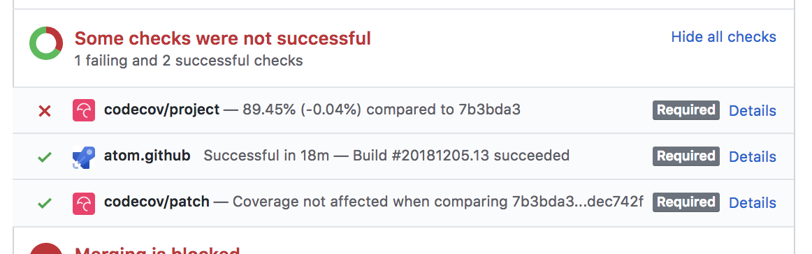 }The "if" branch will be covered only on the six Linux and macOS builds, for example. Similarly, if there's anywhere that we test for some functionality in the Atom API that hasn't made it the whole way through stable yet, those "if" blocks will only be covered on dev or dev and beta builds. Coveralls had a system we could have used to unify these, but because I could only get Coveralls working from Travis, it didn't matter - we only had a single Linux build that produced a single CodeCov, on the other hand, does this automatically. Basically it watches the other statuses reported on the same commit and merges in any reports it's given for the same commit sha before CI has reported a final green or red status. It's a nice bit of bonus functionality that we get without extra work, and as a result we'll be able to see coverage across platforms and across channels, which will be nice. |