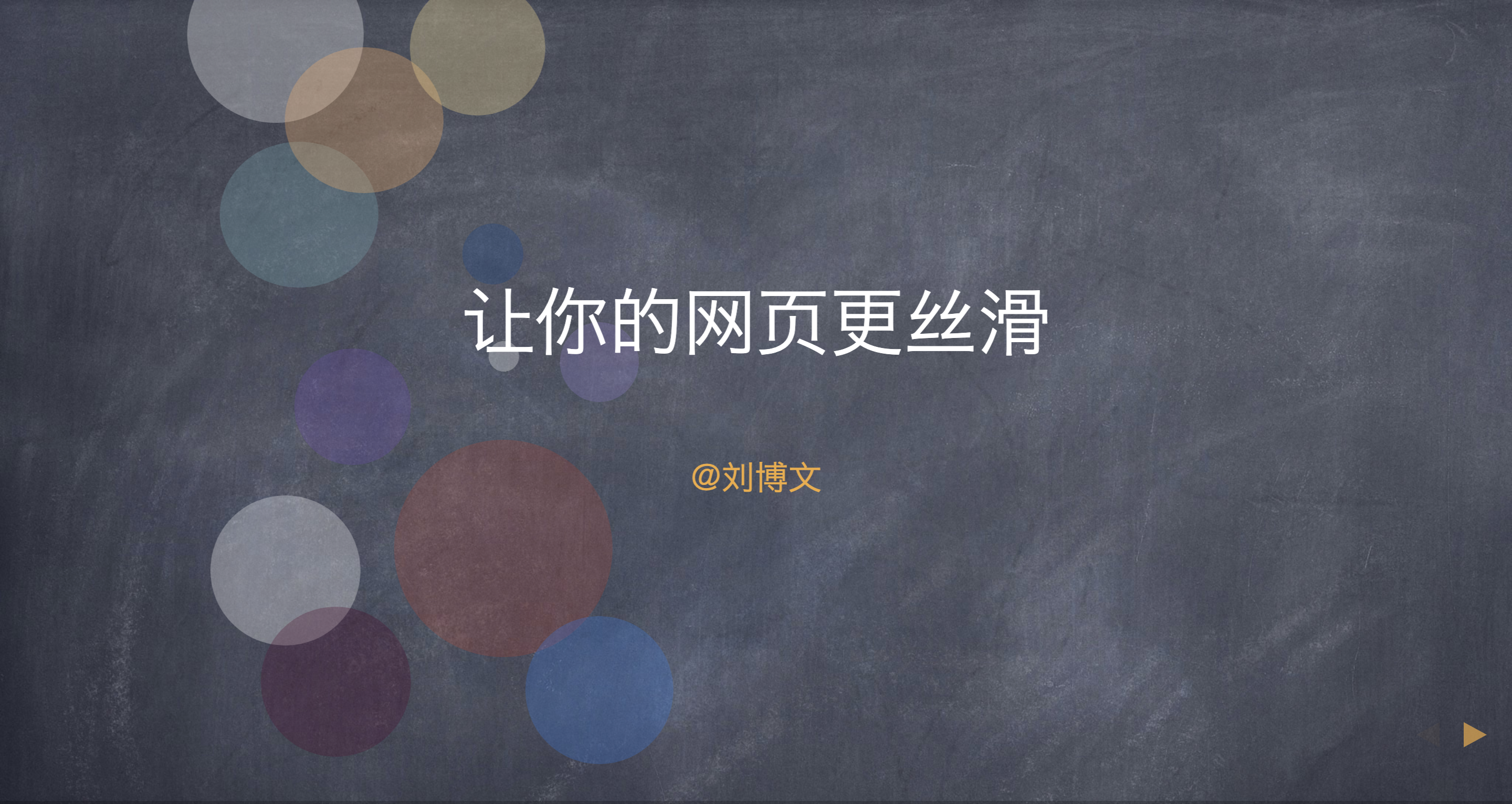 大家好,我叫刘博文,今天给大家分享的主题叫《让你的网页更丝滑》,其实就是更流畅的意思。