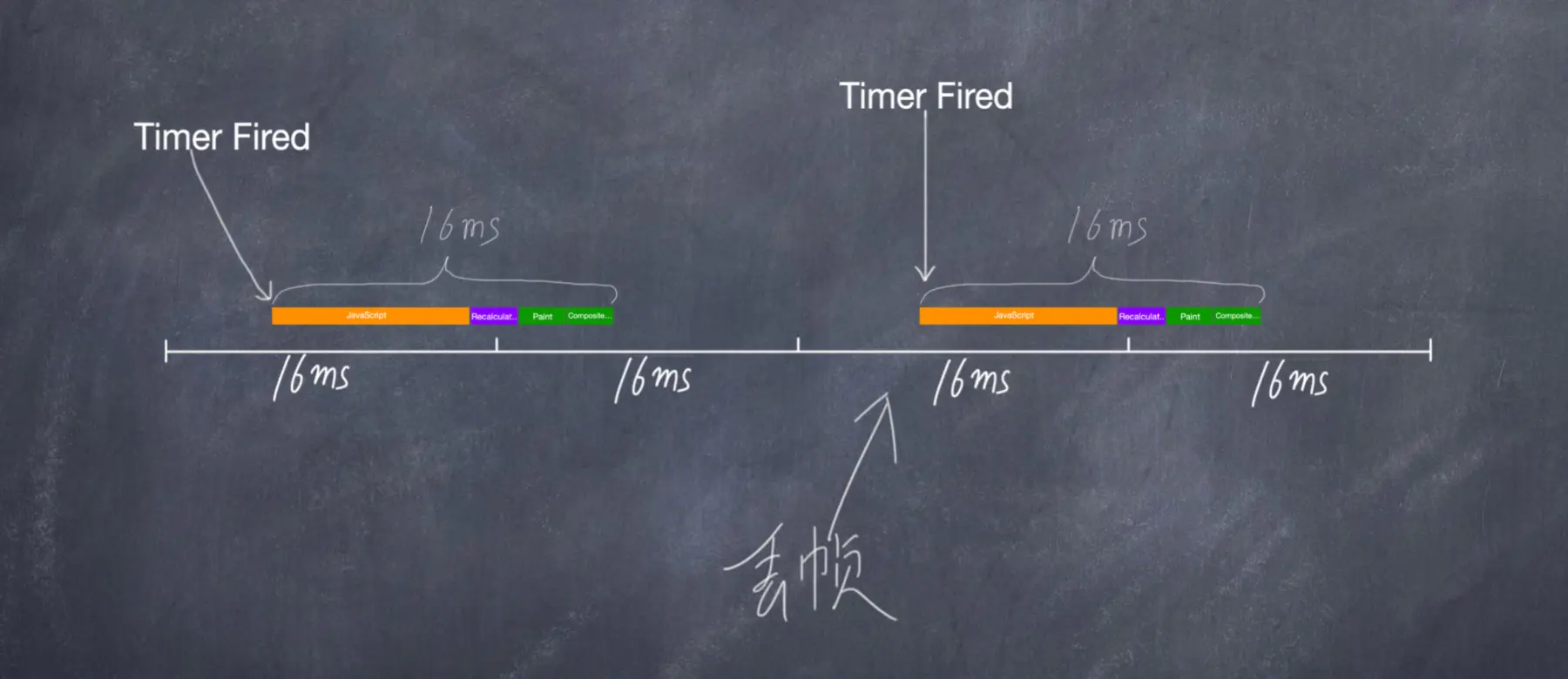 图中这是一个时间轴,每个时间节点之间的间隔是 16 毫秒,我们通常会使用Timer触发一个函数改变一些样式,从而实现视觉的效果。