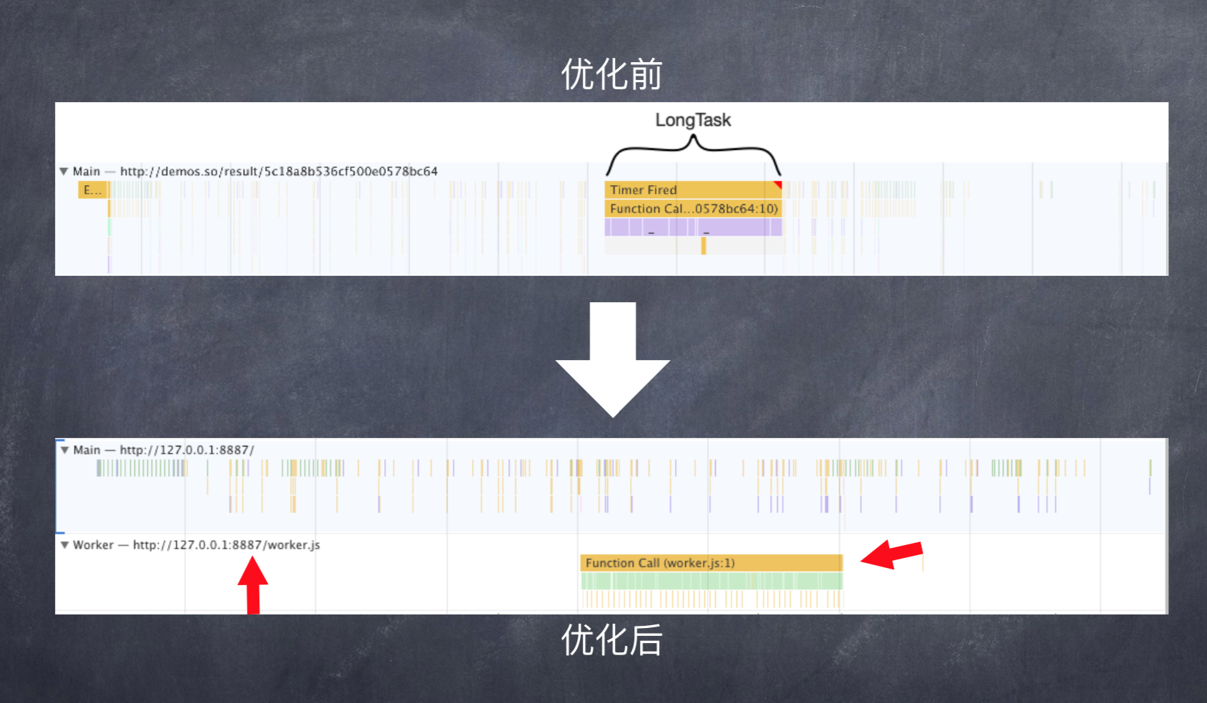 我们通过捕获火焰图,发现优化前其实长任务是主线程中工作,优化之后是放在 Worker 来进行的,所以我的主线依然可以处理其他的任务。