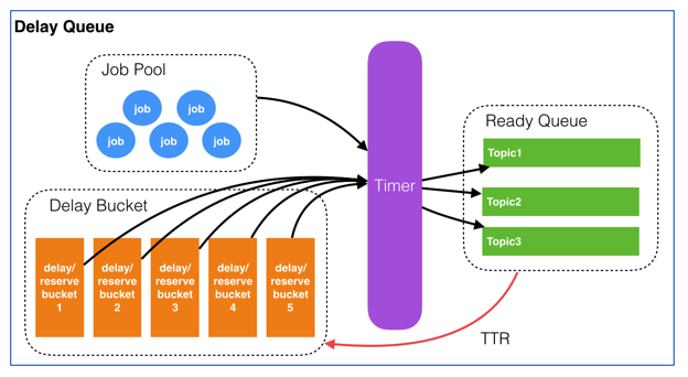 - Timer: It is a core component to scan the Delay Bucket. It pops out ready jobs from Buckets and put then inside ready queue.