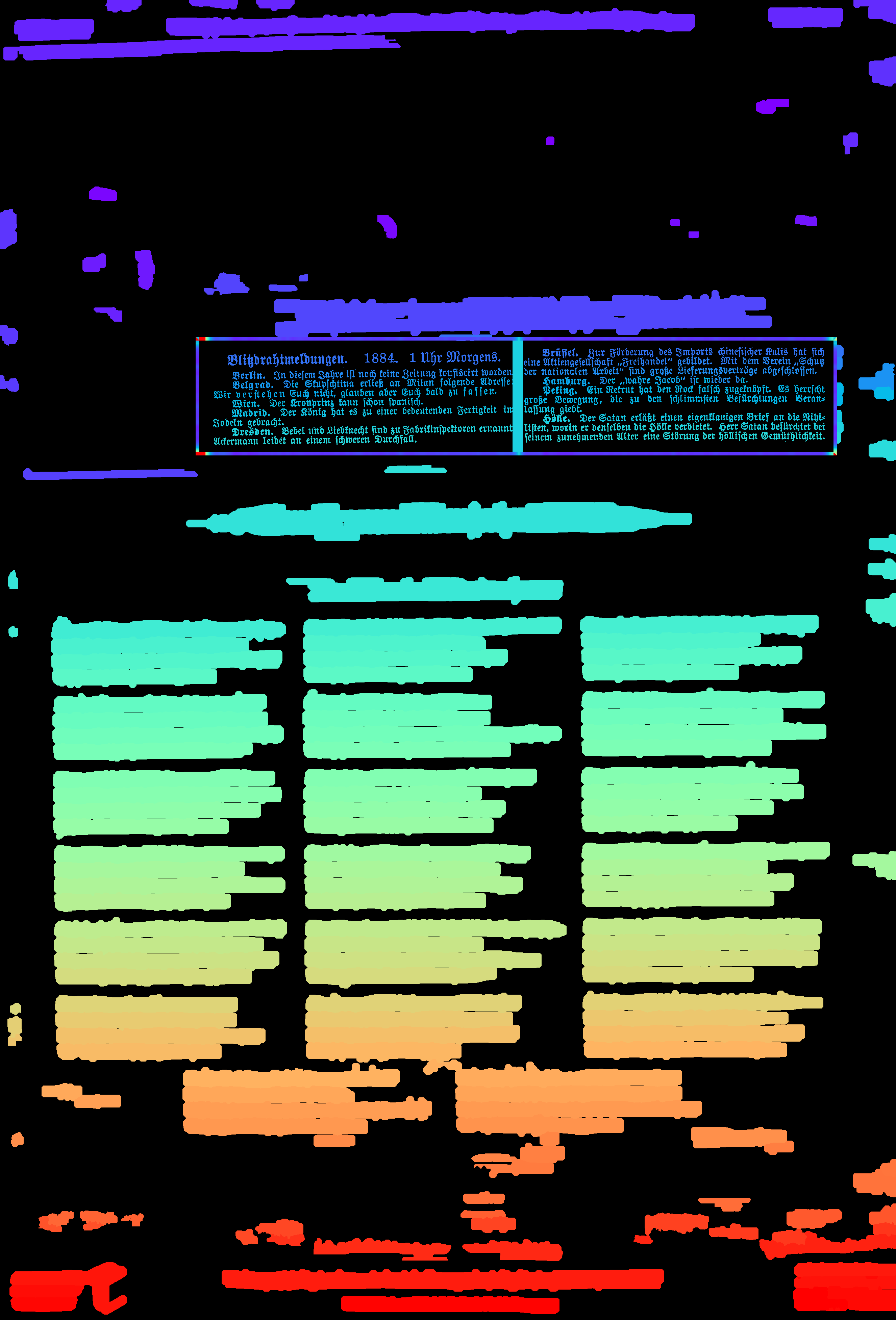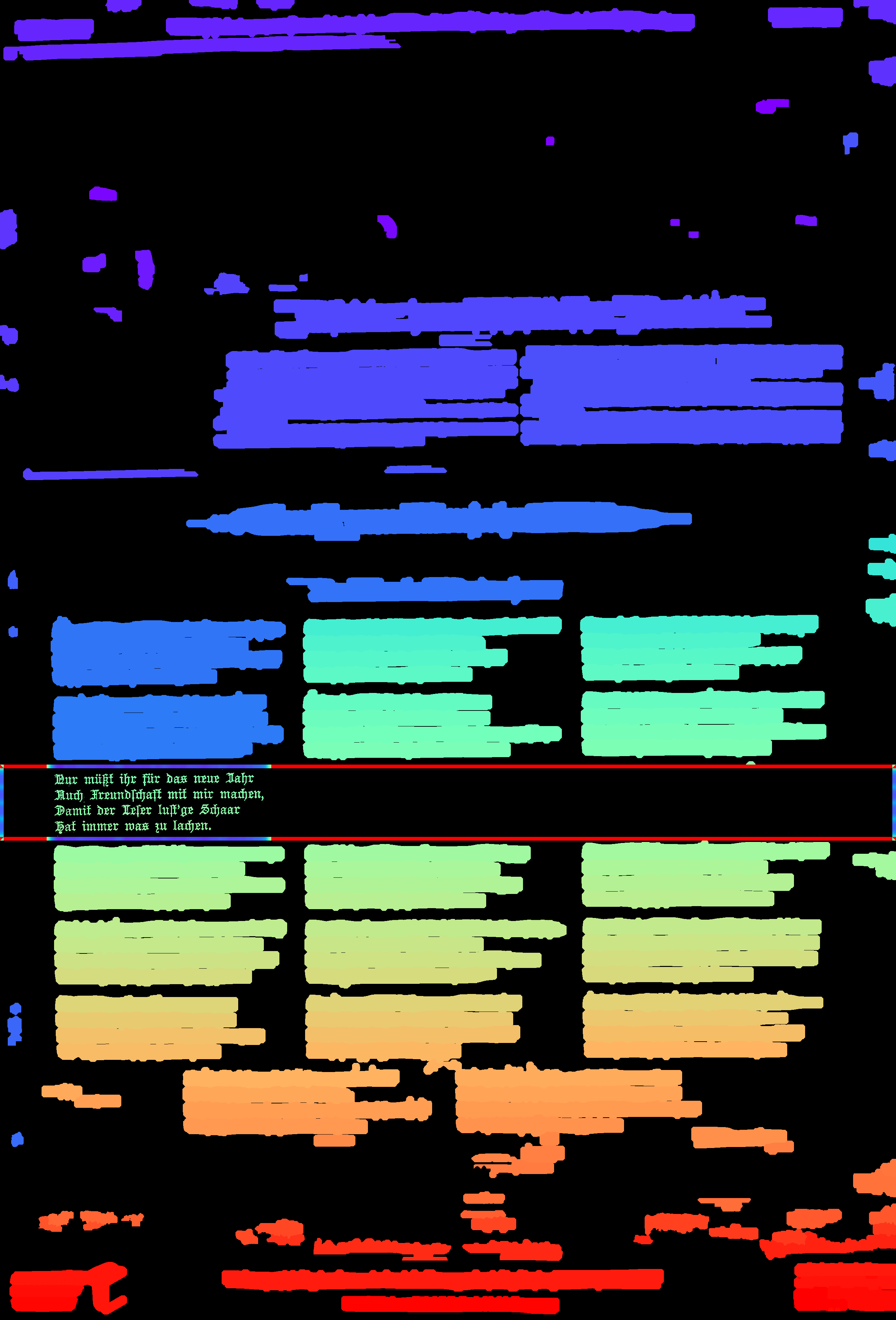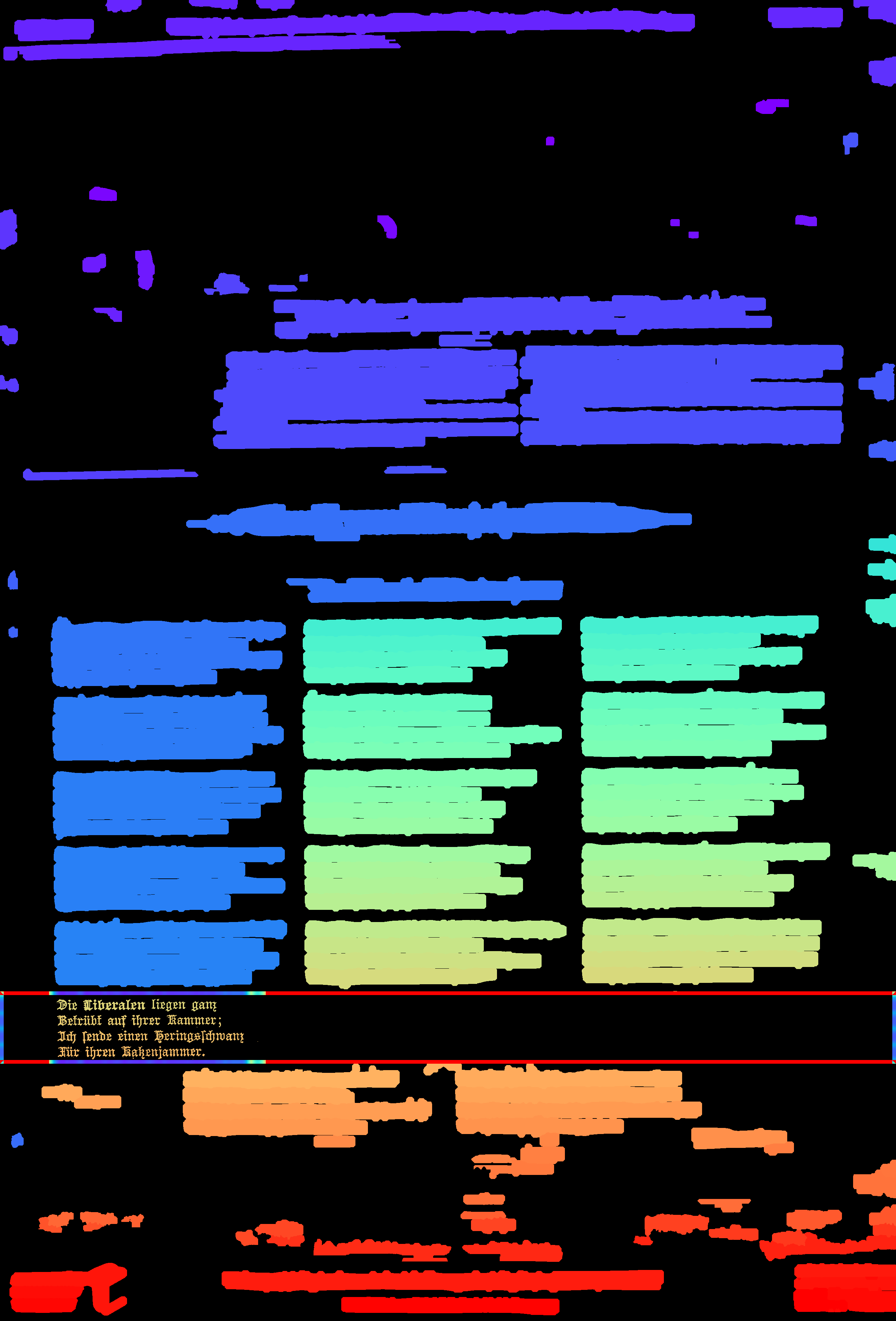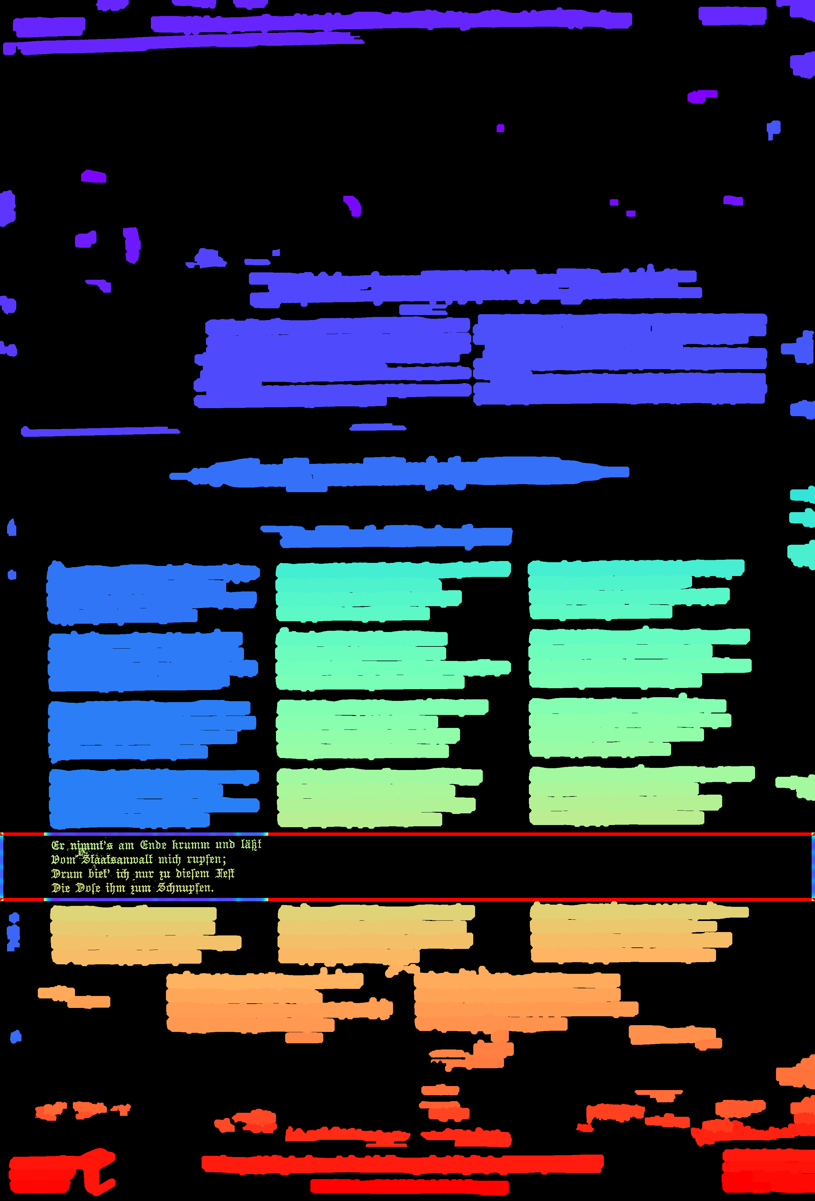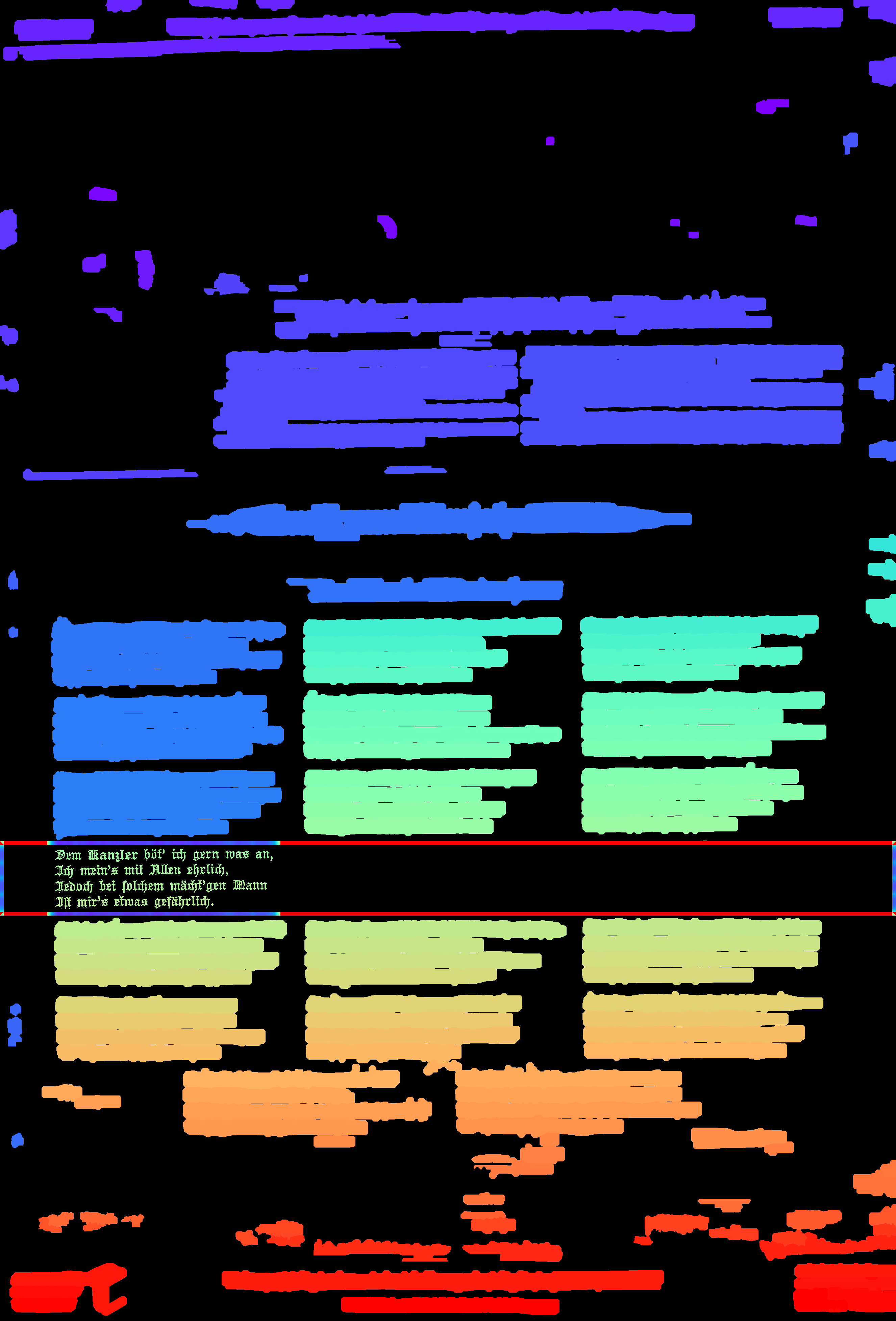 - compute_images: new function to detect and suppress large foreground objects early on that are not h/v-lines (and _not_ search for h/v-lines or assign text lines within them); this could be true graphics/photos/figures, but also drop-capitals - compute_hlines / compute_separators_morph: reconstruct after opening by length not by keeping any overlapping component, but only up to a certain distance (to avoid overlapping glyphs but still get most of the line's parts); ignore parts that already belong to image components identified by compute_images (so they don't compete in n-best race) - compute_colseps_conv: - don't blur away small/protruding glyphs below fg/bg threshold - don't use cleaned but raw boxmap (again) to avoid marking small fg as bg - compute_segmentation: filter out line labels that only have noise fg (i.e. components that have been filtered as too small/large) - ensure odd kernel sizes everywhere - DSAVE (visualization for debugging): use uniformly bright and maximally differentiating colormap, and set off 0 (background) to black; allow passing a second array with foreground as white