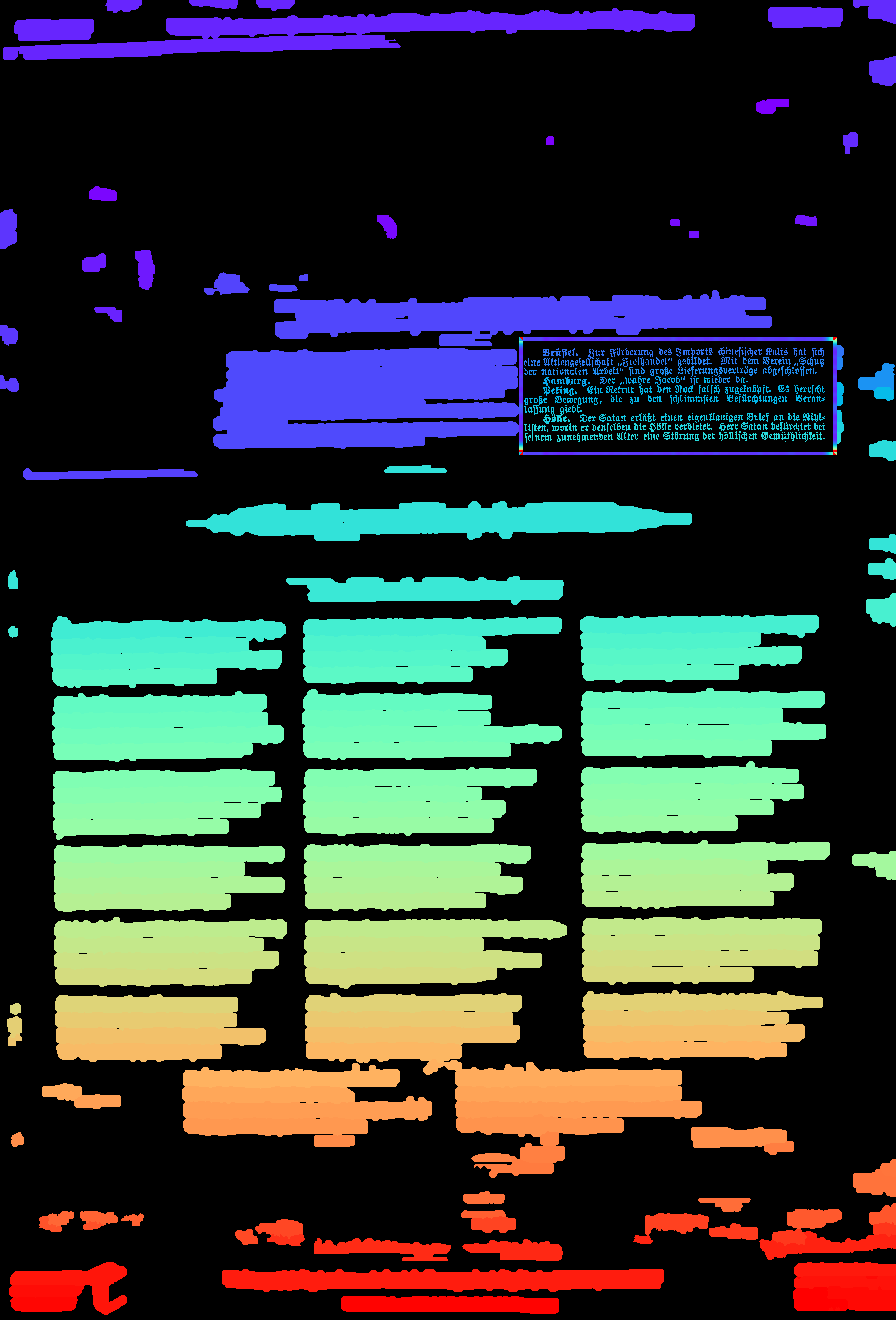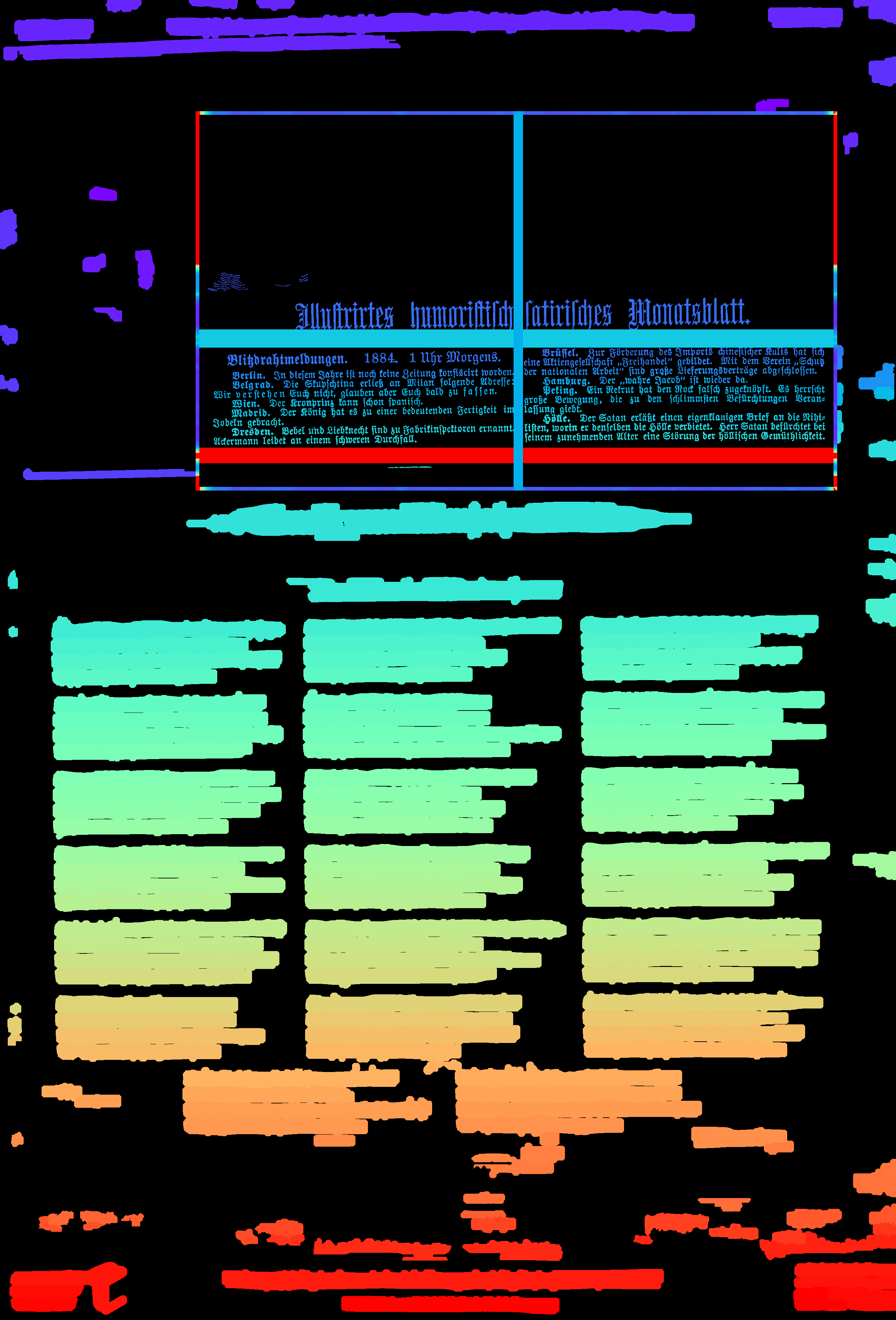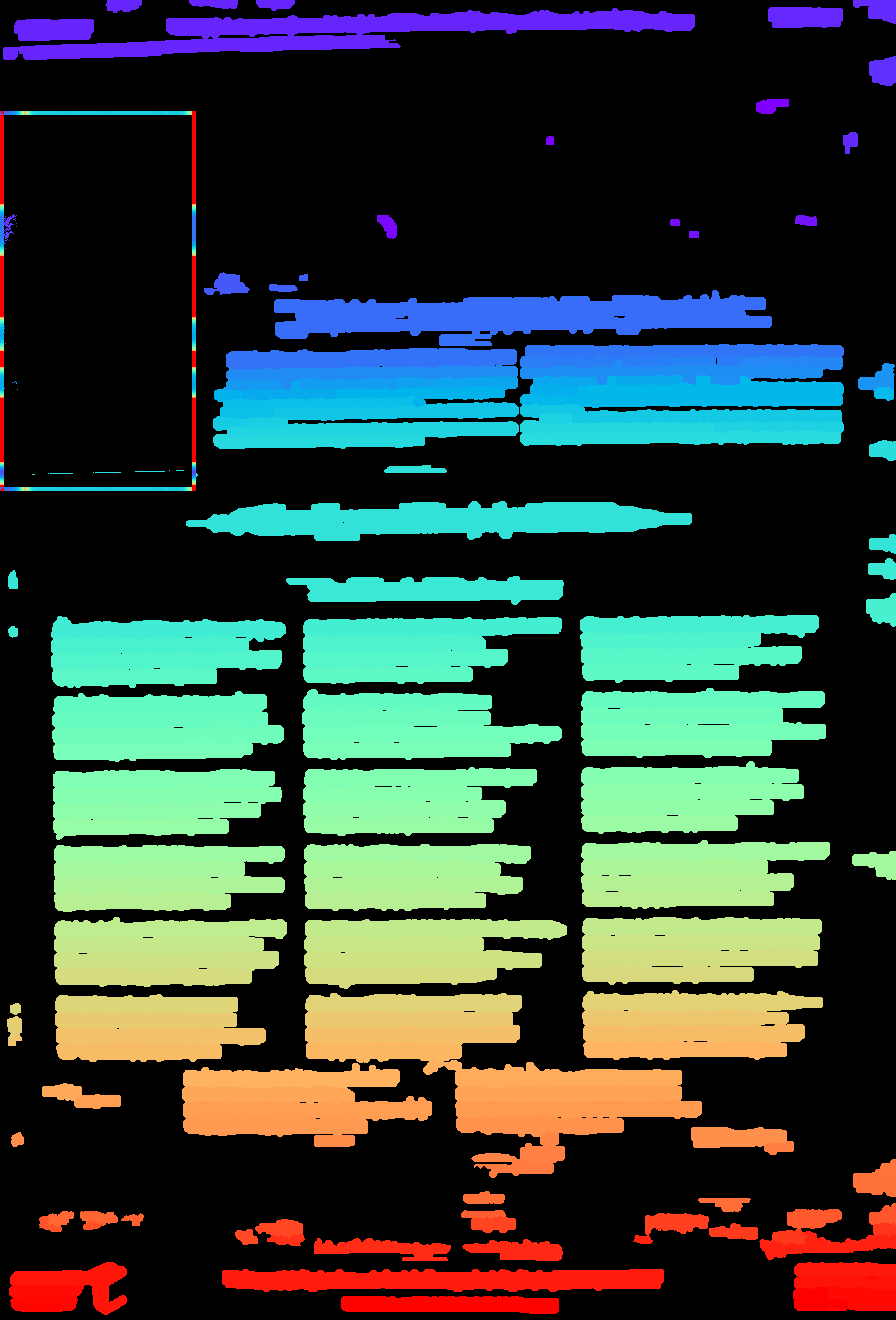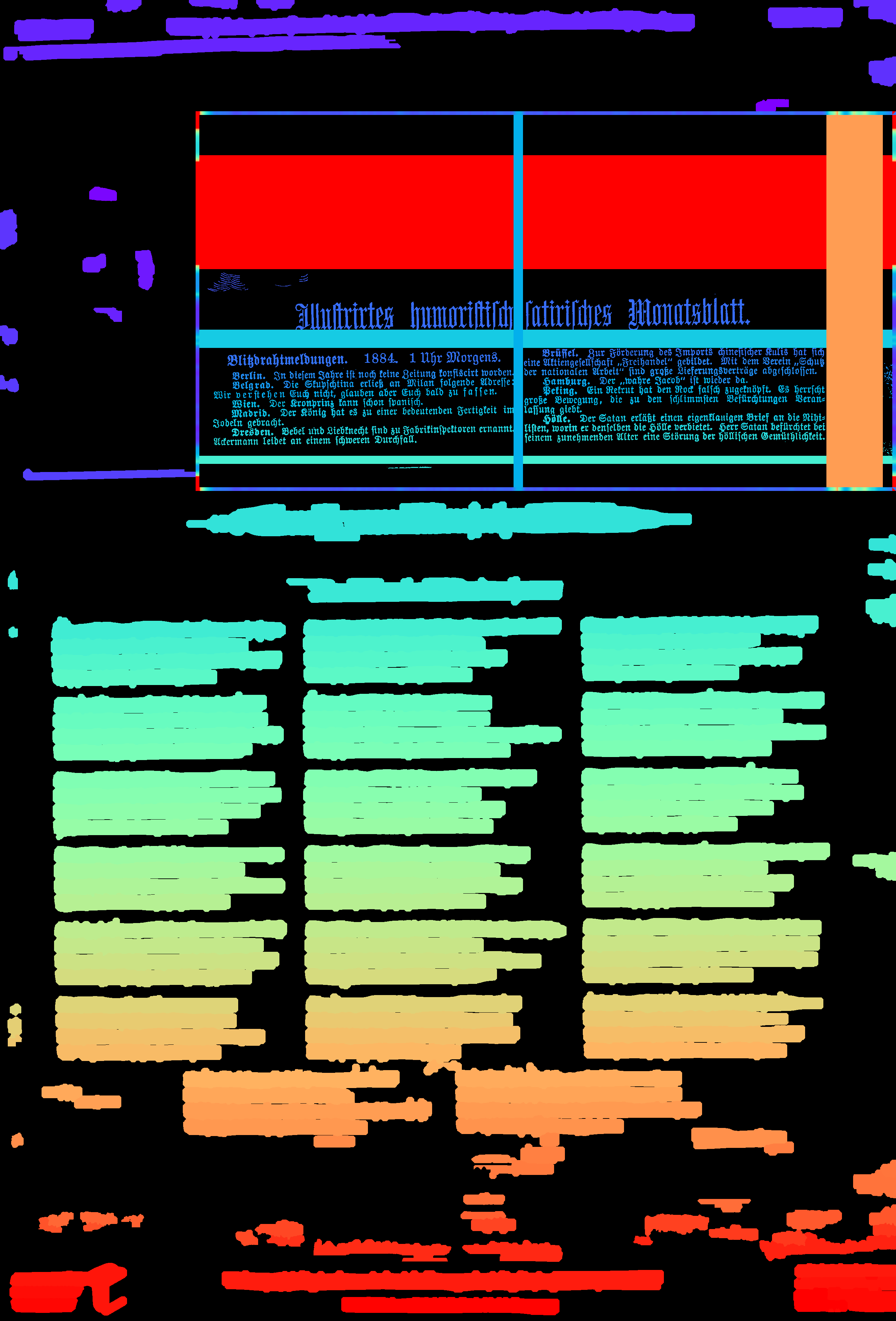 - compute_images: new function to detect and suppress large foreground objects early on that are not h/v-lines (and _not_ search for h/v-lines or assign text lines within them); this could be true graphics/photos/figures, but also drop-capitals - compute_hlines / compute_separators_morph: reconstruct after opening by length not by keeping any overlapping component, but only up to a certain distance (to avoid overlapping glyphs but still get most of the line's parts); ignore parts that already belong to image components identified by compute_images (so they don't compete in n-best race) - compute_colseps_conv: - don't blur away small/protruding glyphs below fg/bg threshold - don't use cleaned but raw boxmap (again) to avoid marking small fg as bg - compute_segmentation: filter out line labels that only have noise fg (i.e. components that have been filtered as too small/large) - ensure odd kernel sizes everywhere - DSAVE (visualization for debugging): use uniformly bright and maximally differentiating colormap, and set off 0 (background) to black; allow passing a second array with foreground as white
