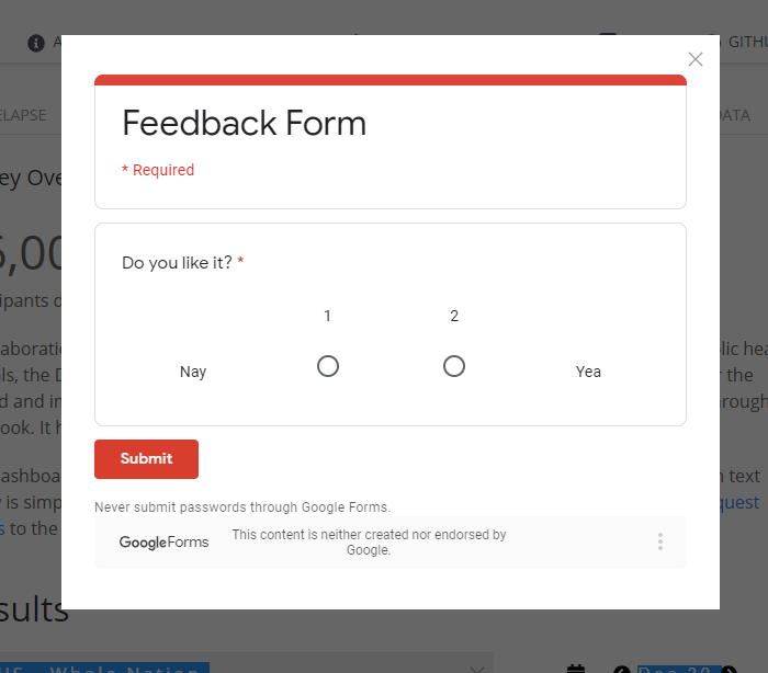 Here are 2 options Blue button: https://www.figma.com/file/IiYu74VmEi4GVS4bnYaTd6/Delphi-Site-Redesign?node-id=1681%3A17 In my experience popups are always annoying and hard to gain engagement. Since we're already interrupting the user by displaying the "Survey Feedback" button, I would actually just display the survey as a popup. If we're able to use cookies to prevent duplicate interruptions, that will likely have the highest rate of engagement at least that's what I've seen in past projects. https://www.figma.com/file/IiYu74VmEi4GVS4bnYaTd6/Delphi-Site-Redesign?node-id=1685%3A30599 It's too bad we're not able to style the survey for the MVP, but this will still be a good experiment. |