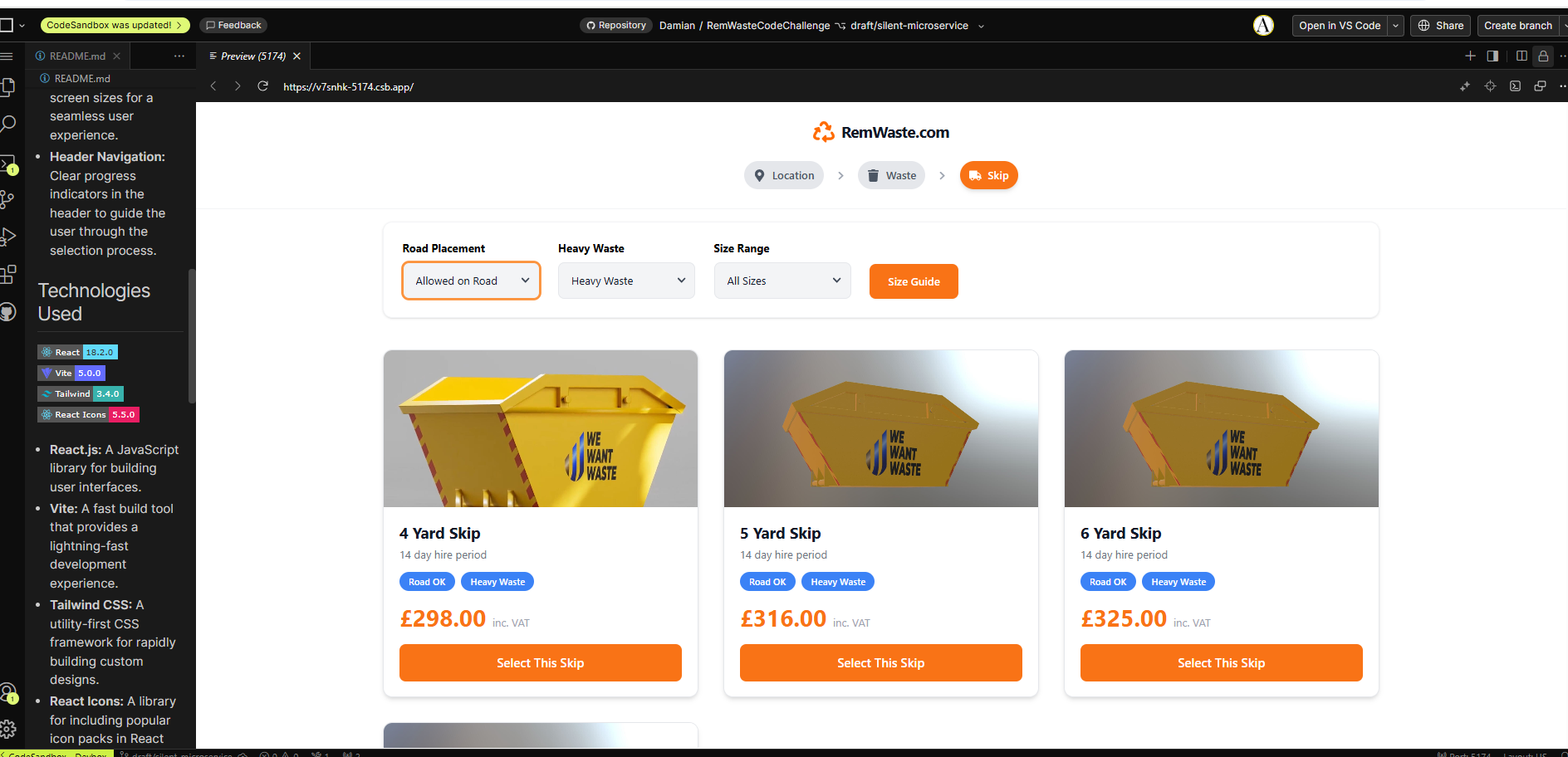 This project is a React-based web application for selecting skips, featuring a dynamic filtering system and an interactive size guide. Users can filter skips by road placement, heavy waste suitability, and size range. The application displays detailed information for each skip, including price and hire period.