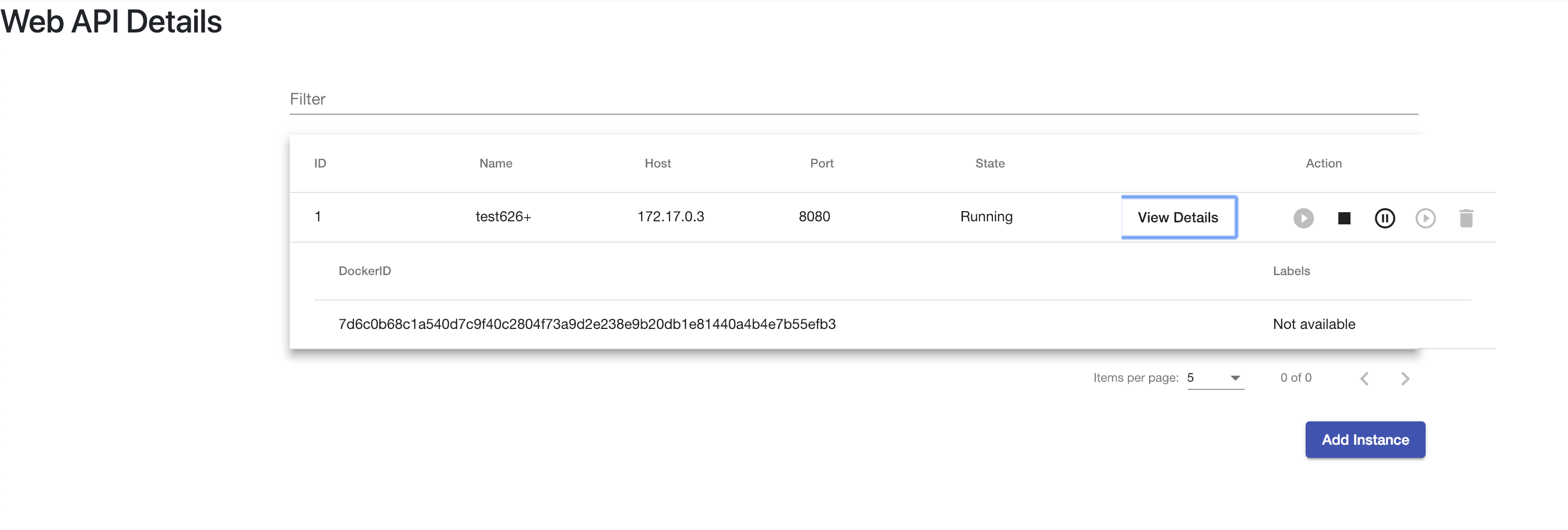 Added table-row expansion feature. It expands the row of a table on clicking the "View Details" button to show the details of an instance such as docker Id and labels. The feature is implemented using Angular-Material table expand-row feature.