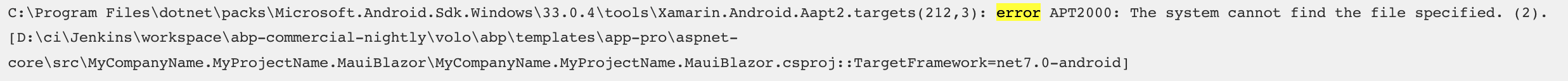 C:\Program Files\dotnet\packs\Microsoft.Android.Sdk.Windows\33.0.4\tools\Xamarin.Android.Aapt2.targets(212,3): error APT2000: The system cannot find the file specified. (2). [D:\ci\Jenkins\workspace\abp-commercial-nightly\volo\abp\templates\app-pro\aspnet-core\src\MyCompanyName.MyProjectName.MauiBlazor\MyCompanyName.MyProjectName.MauiBlazor.csproj::TargetFramework=net7.0-android]