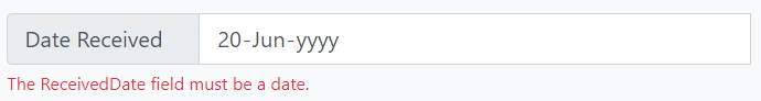The error message displays: "The ReceivedDate field must be a date." (Notice the lack of space on the field name).