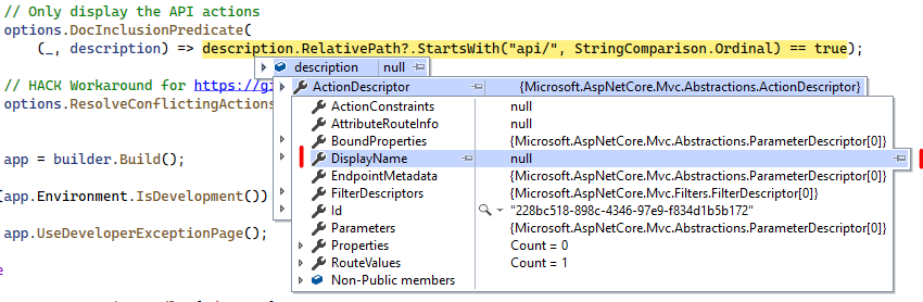 .WithDisplayName("DENIED");Then inspect the ApiDescription in the debugger, such as with the DocInclusionPredicate() when using AddSwaggerGen():