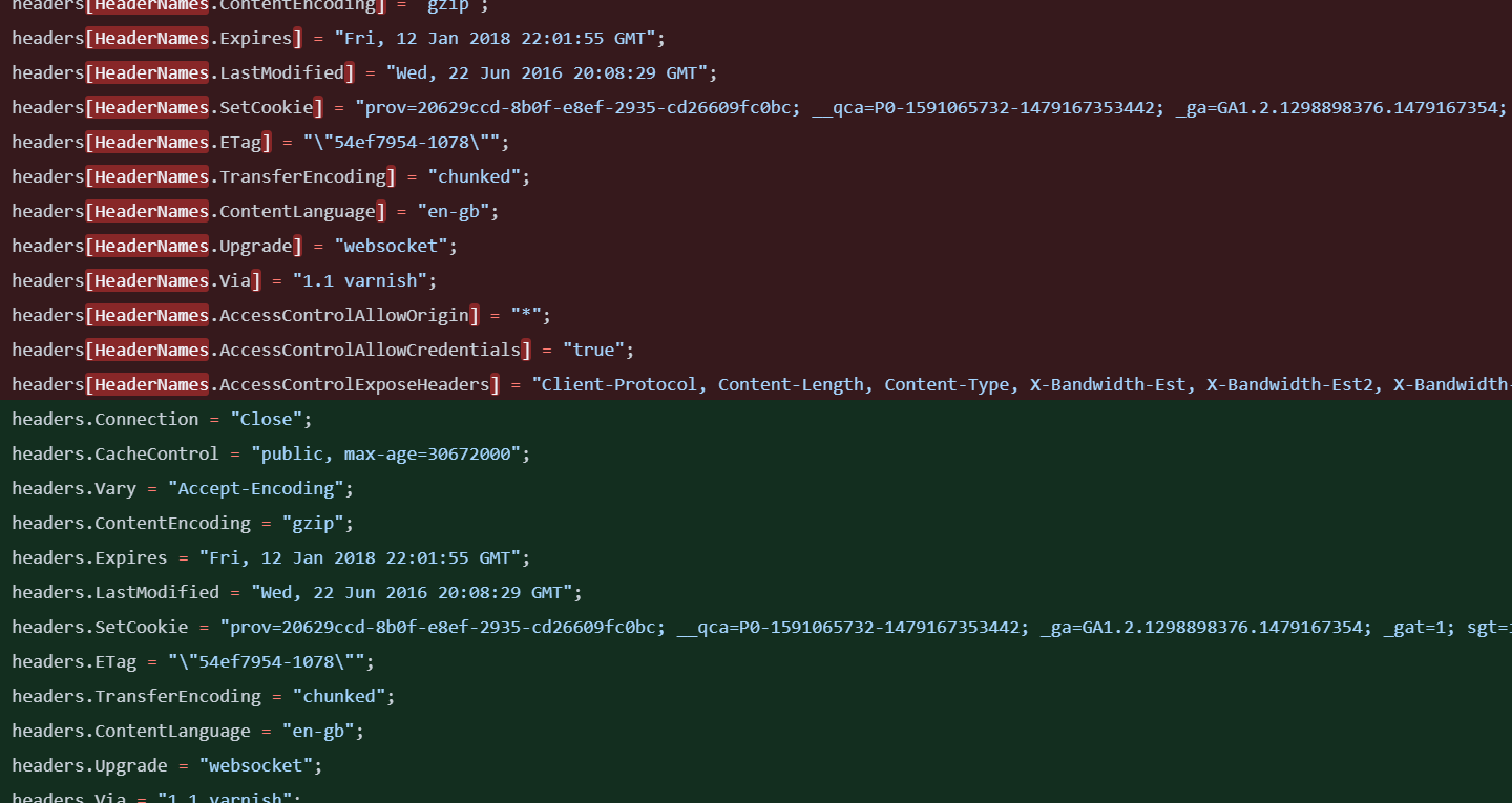 Content-Type(indirectly viaDefaultHttpRequest.ContentType)Content-Type,Connection,Cache-Control,Vary,Content-Encoding,Expires,Last-Modified,Set-Cookie,ETag,Transfer-Encoding,Content-Language,Upgrade,Via,Access-Control-Allow-Origin,Access-Control-Allow-Credentials,Access-Control-Expose-HeadersContent-Type,Link,X-UA-Compatible,X-Powered-By,X-Content-Type-Options,X-XSS-Protection,X-Frame-Options,Strict-Transport-Security,Content-Security-PolicyExample user code change to take advantage of fast-path (outside of the default features/middleware/mvc)