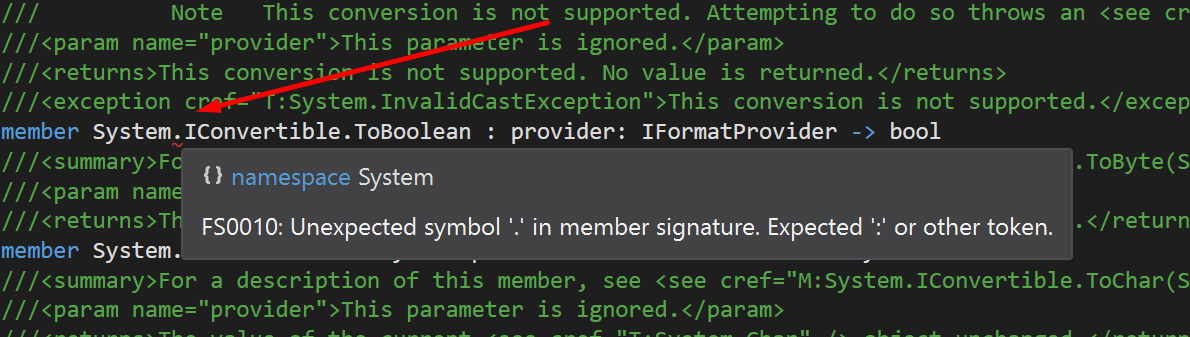 Notice that deep in the definition contains a fully qualified name, System.IConvertible.ToBoolean. This is actually an incorrect signature file, so it stops colorization and prevents navigating in the document: