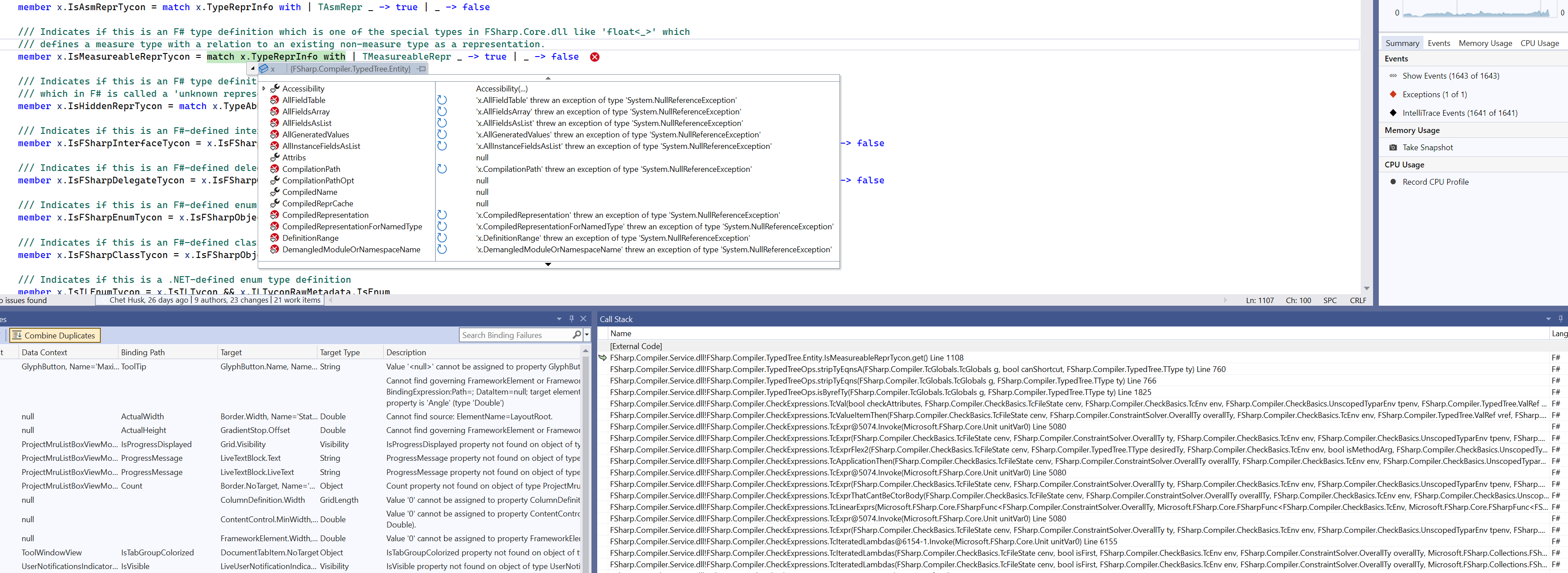However, when going into a project that directly or indirectly depends on Fsharp.Compiler.Service, language features stopped to work, demonstrated by a Object reference exception coming out of it.