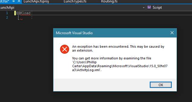 at Microsoft.VisualStudio.FSharp.Editor.FSharpCompletionProvider.ShouldTriggerCompletion(SourceText sourceText, Int32 caretPosition, CompletionTrigger trigger, OptionSet _arg1)