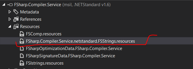 is FSharp.Compiler.Service.netstandard.FSStrings.resources, instead of FSStrings.resources, that cause a runtime error: