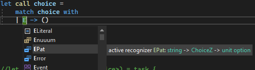 When it's determined we're pattern matching against a DU of a specific type, the completions will only show the latter's cases as well as compatible active patterns in scope.