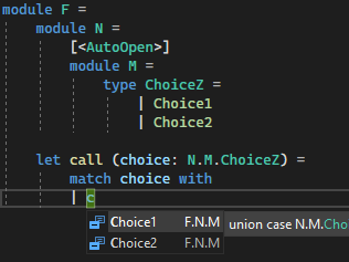 I'm really pleased with the outcome. DU type is added automatically when qualified access is required. When the cases are not in scope, the appropriate namespace will be opened on commit: When we're matching against an unknown type, only items that are legal in a match clause pattern are shown, namely literals, enums, union (cases), exception cases, active patterns, modules and namespaces: Union cases, among other completion items, unfortunately fall under Marking it as ready for review. Tests will be added once the other completion PRs are merged in order to avoid conflicts. |
