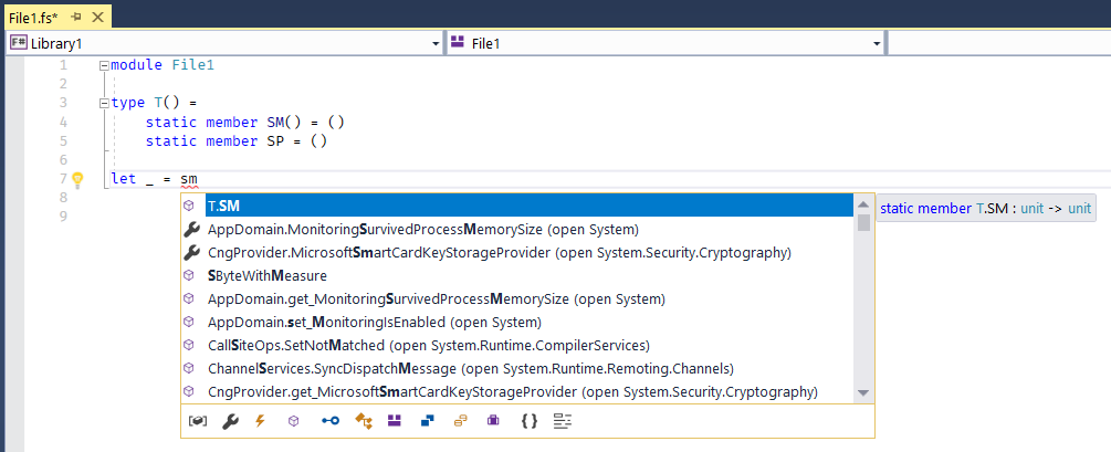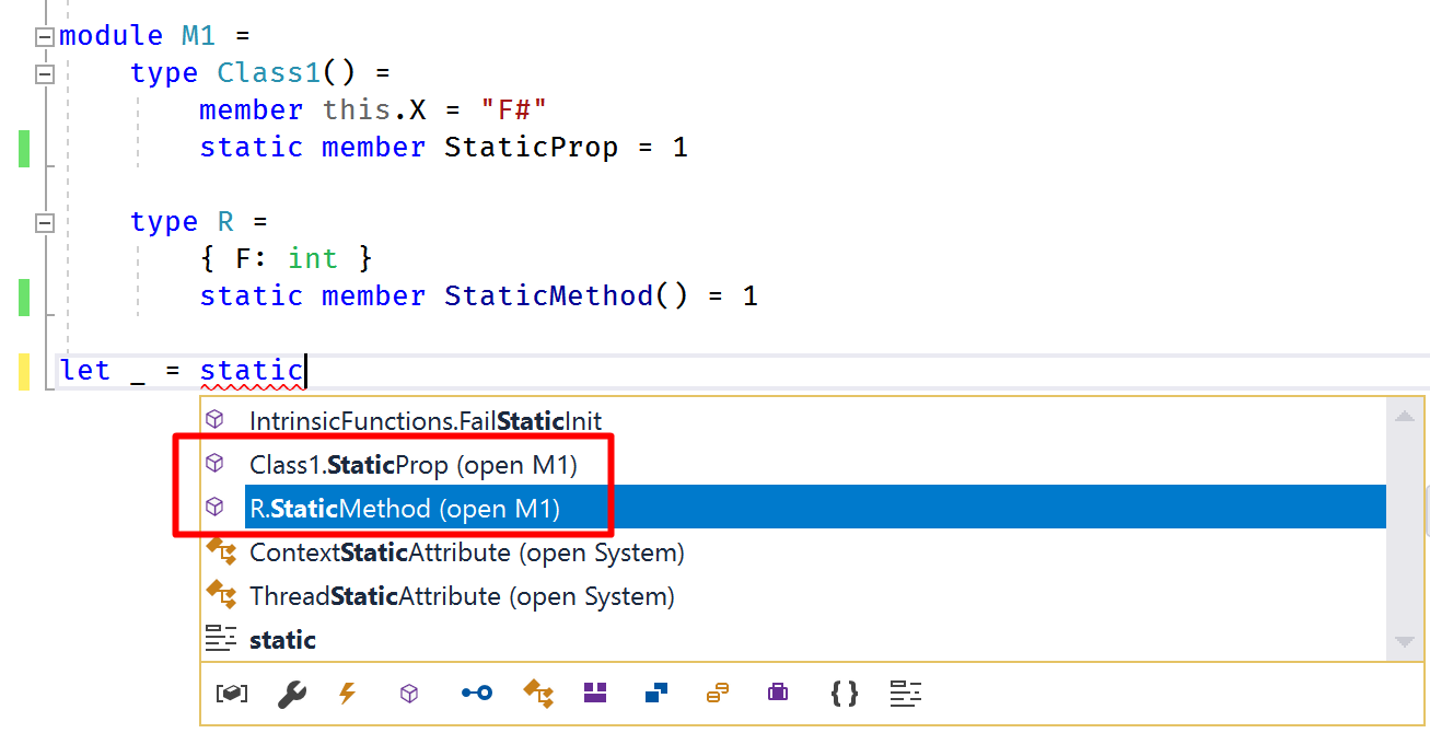 Why are we showing static members? Surely these should only show after you’ve dotted into the type that has the static members? |