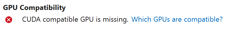 For the text classification scenario, when I cancel training, it hangs and the the process never seems to finish. Closing the .mbconfig file and opening it again shows that the there is no compatible GPU, even though I do have a compatible GPU.