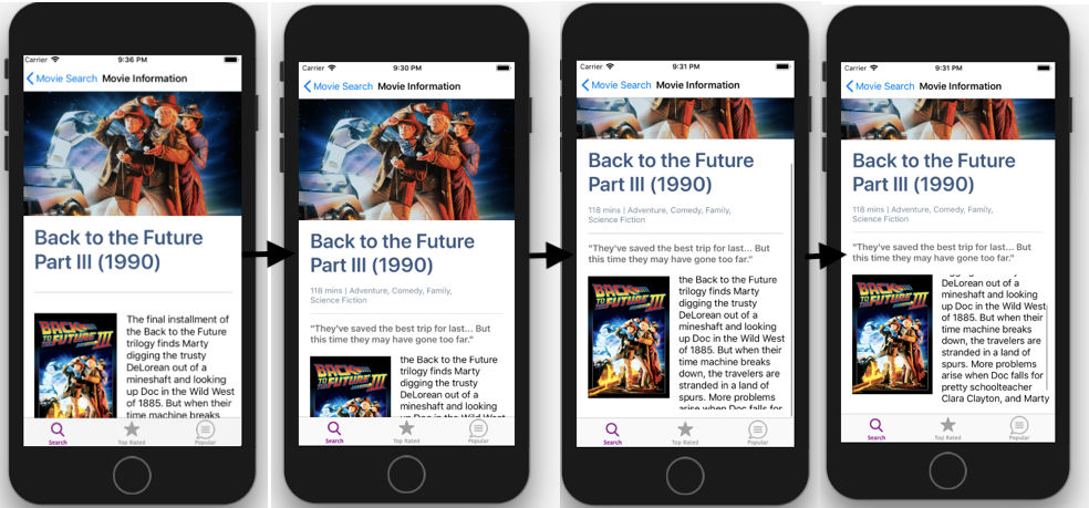 (In the first frame, the tagline and runtime have not yet been fetched to demonstrate the view's lazy load. Then after a brief period this is fetched and the end results is as shown in the second frame. The third and the fourth frame display possible scrolling of the view and the overview section)
