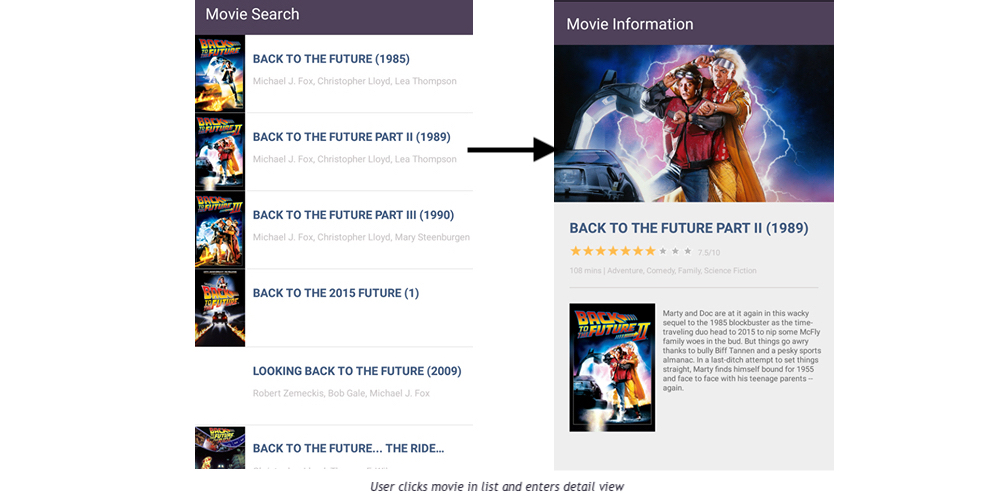 Once resources have been retrieved, user is navigated to the next screen (i.e. a new activity starts on top of the fragment activity which can be retracted via back button present on android phones) which includes a list view displaying all movies that matched user query string. Each item (movie) in that list is clickable and navigates user to another screen (again, starts a new activity) which displays images and details of that movie: