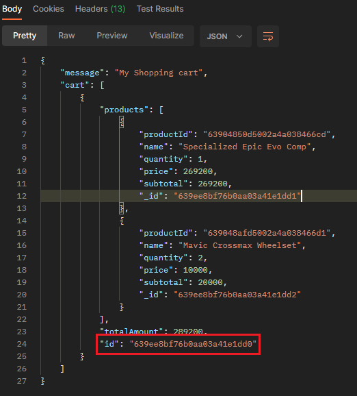 [ { "productId": "63904850d5002a4a038466cd", "quantity": 1 }, { "productId": "639048afd5002a4a038466d1", "quantity": 2 } ] -