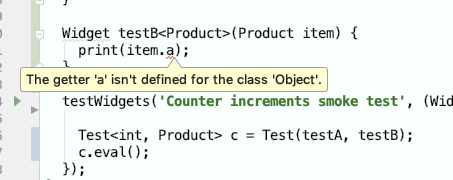 So basically I want to create a generic class(Test<T, F>) but with some variable(_cellBuilder) has an external typedef type(CellBuilder<F>) outside the class. testA with String assigned runs fine, but testB failed just as the screenshot shows.
