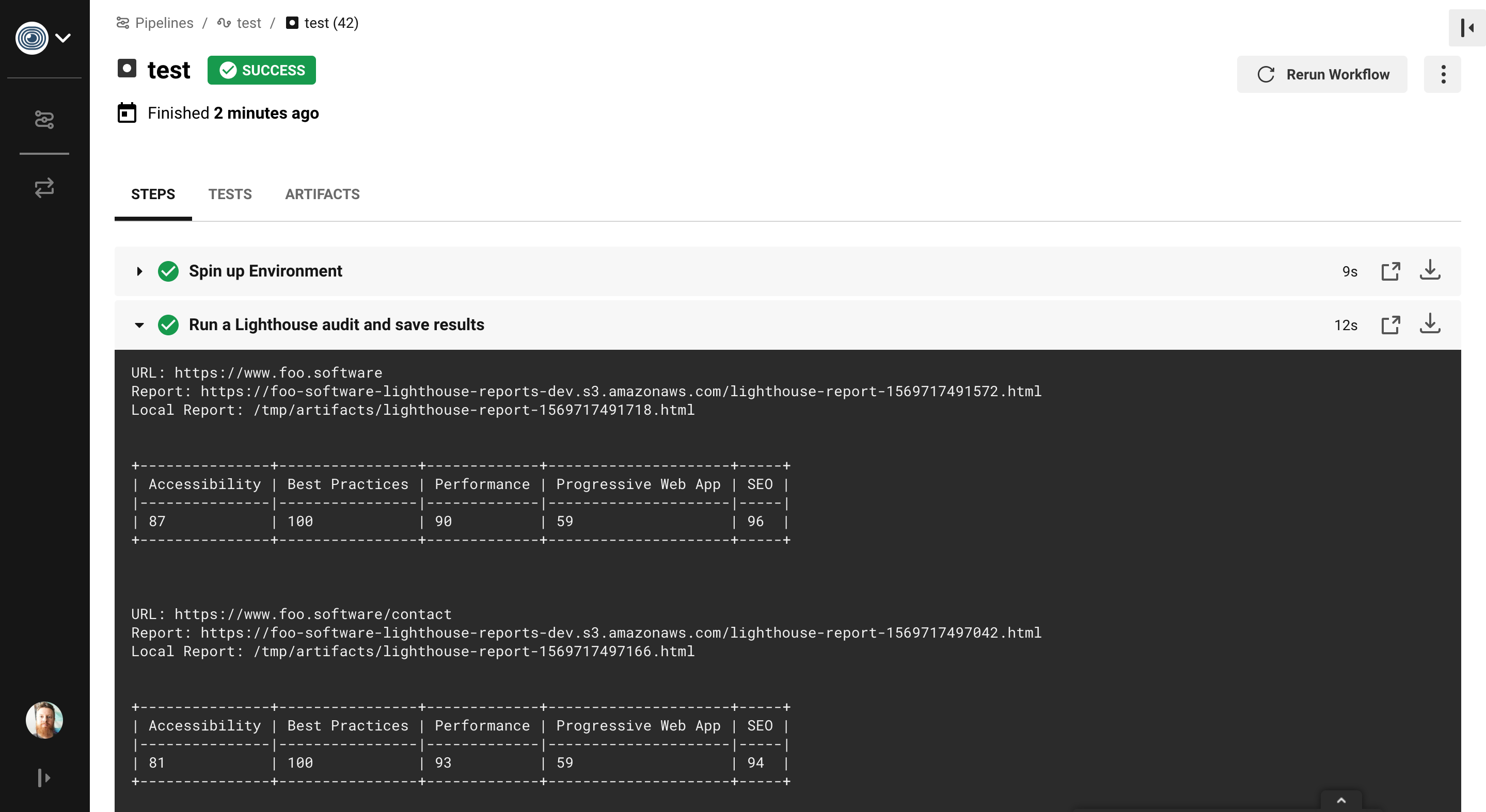 In the below example we run Lighthouse on two URLs, log scores, save the HTML reports as artifacts, upload reports to AWS S3, notify via Slack with details about the change from Git data.