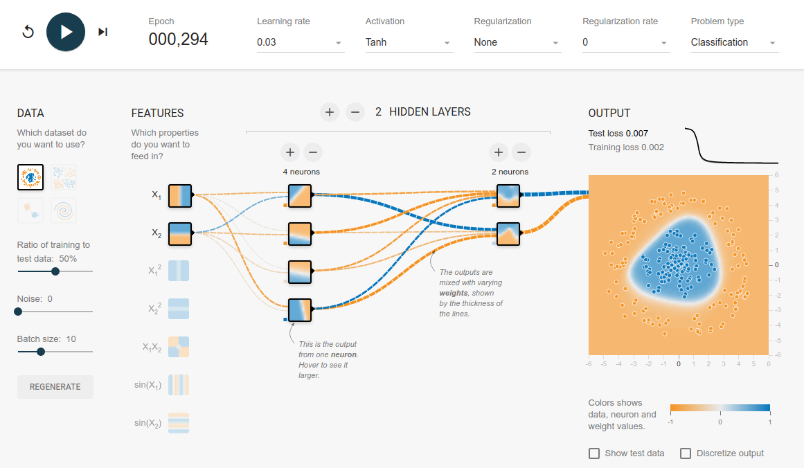 This type of applications are awesome for introducing machine learning to people by showing how the internals work. I can imagine things like https://playground.tensorflow.org/ can be implemented with Fable (that type of thing would definitely work very well with the reference backend due to being small-scale). I think this would be a very good starting point to establish the setup:
