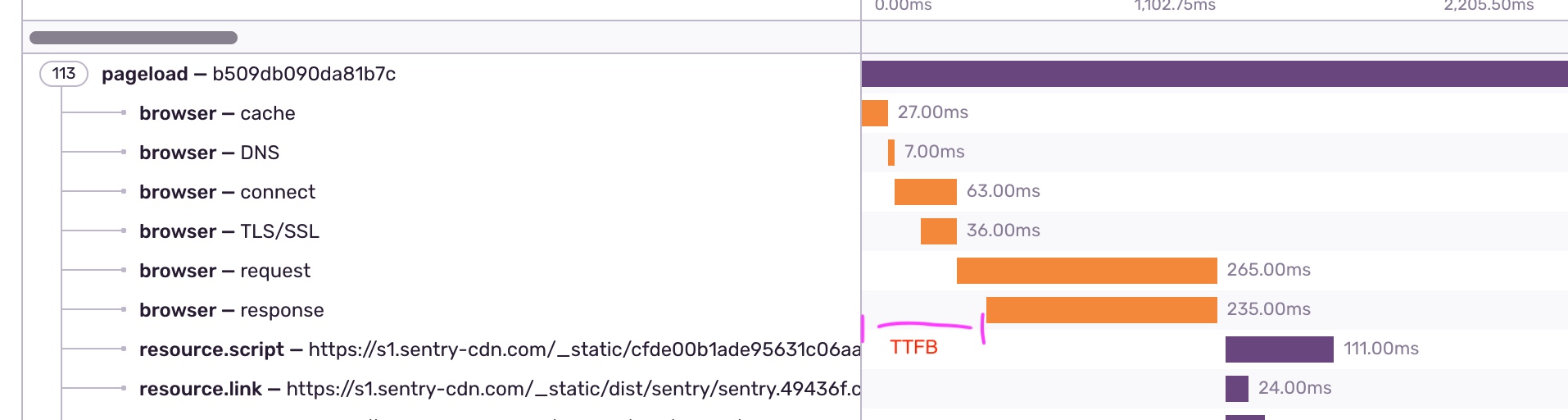 timeOrigin, the TTFB metric as measured by the web-vitals library may not match what's visualized from the captured span data. Thus, it's preferred that we generate TTFB from the span data.This also implicitly addresses negative TTFB values that could be generated from Firefox browsers.