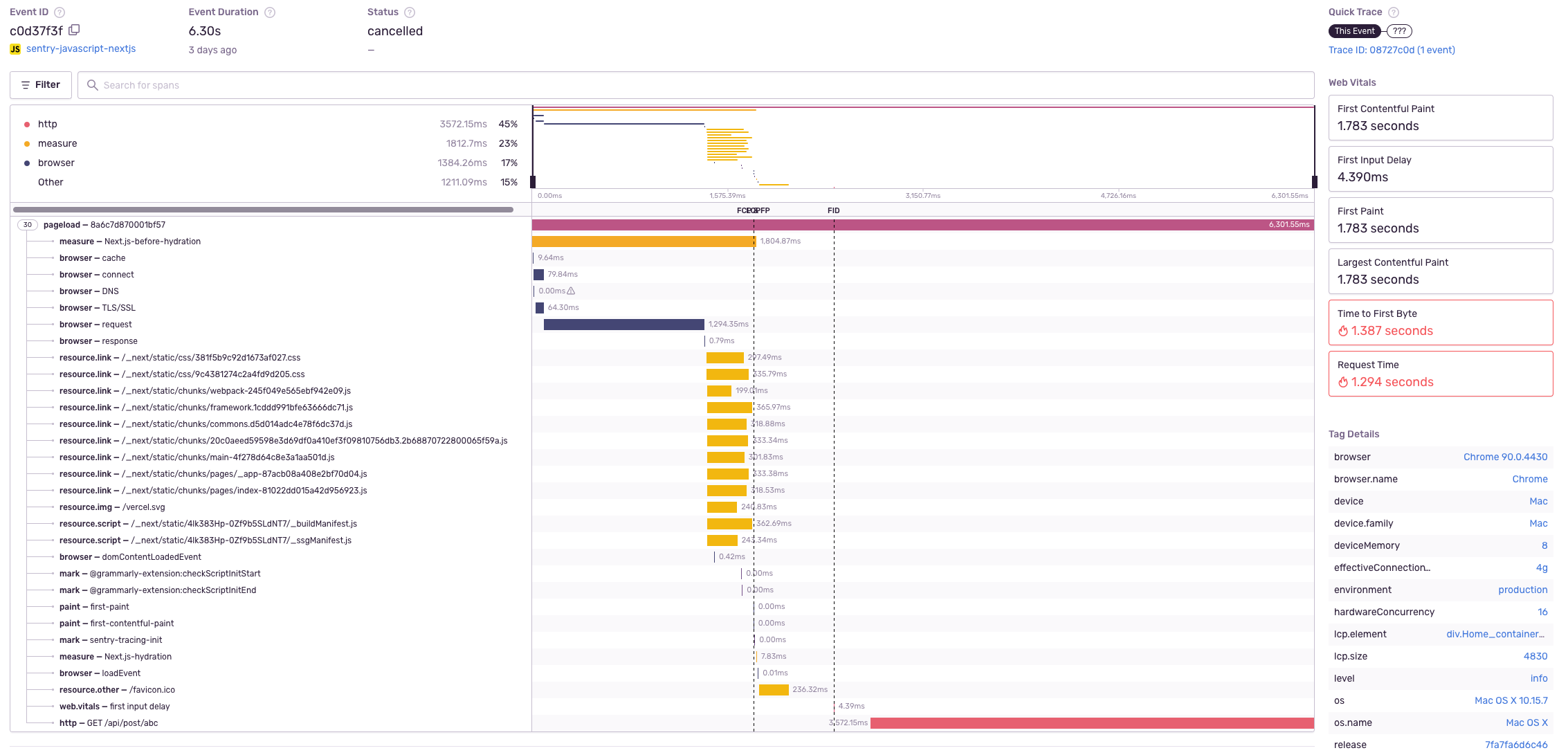 This enables front end and API route performance monitoring in