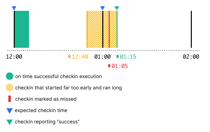 01:05the expected checkin at01:00is marked as missed since no checkin happened within the 5 minute checkin margin. - Finally the job started at